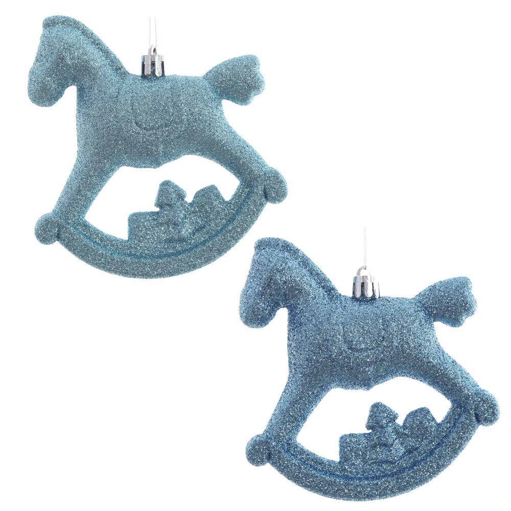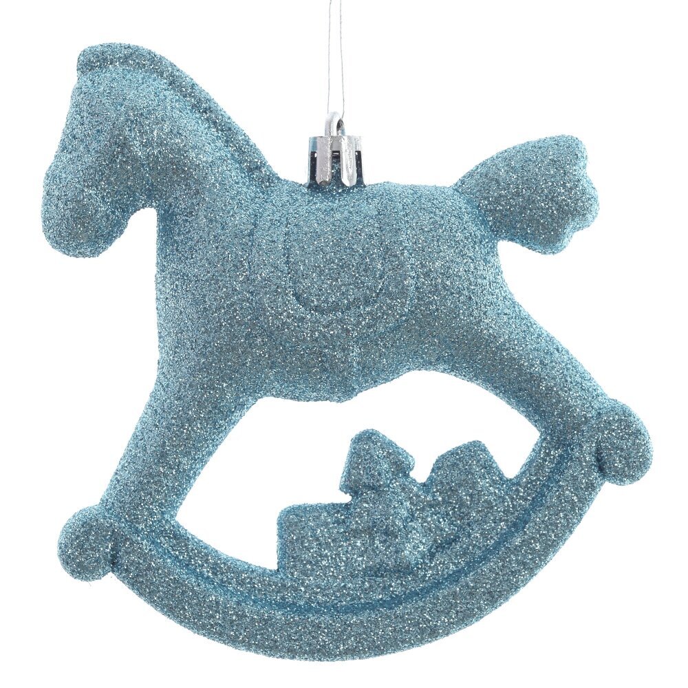 Набор из 2 новогодних украшений в виде "Лошадки". Идеально подходит для создания праздничной атмосферы в 2026 году, посвященного этой тематике. Изготовлено из прочных полимерных материалов, голубой цвет в сочетании с глиттером делает его захватывающим и элегантным. Отличный выбор для новогодних декораций, оформления интерьера и оригинальных подарков. Создайте волшебное настроение и добавьте очарования вашей новогодней вечеринки. Украшения станут прекрасным дополнением к праздничному декору, подчеркнут стиль и создадут атмосферу волшебства. Они могут использоваться для украшения елки или для создания тематических композиций.