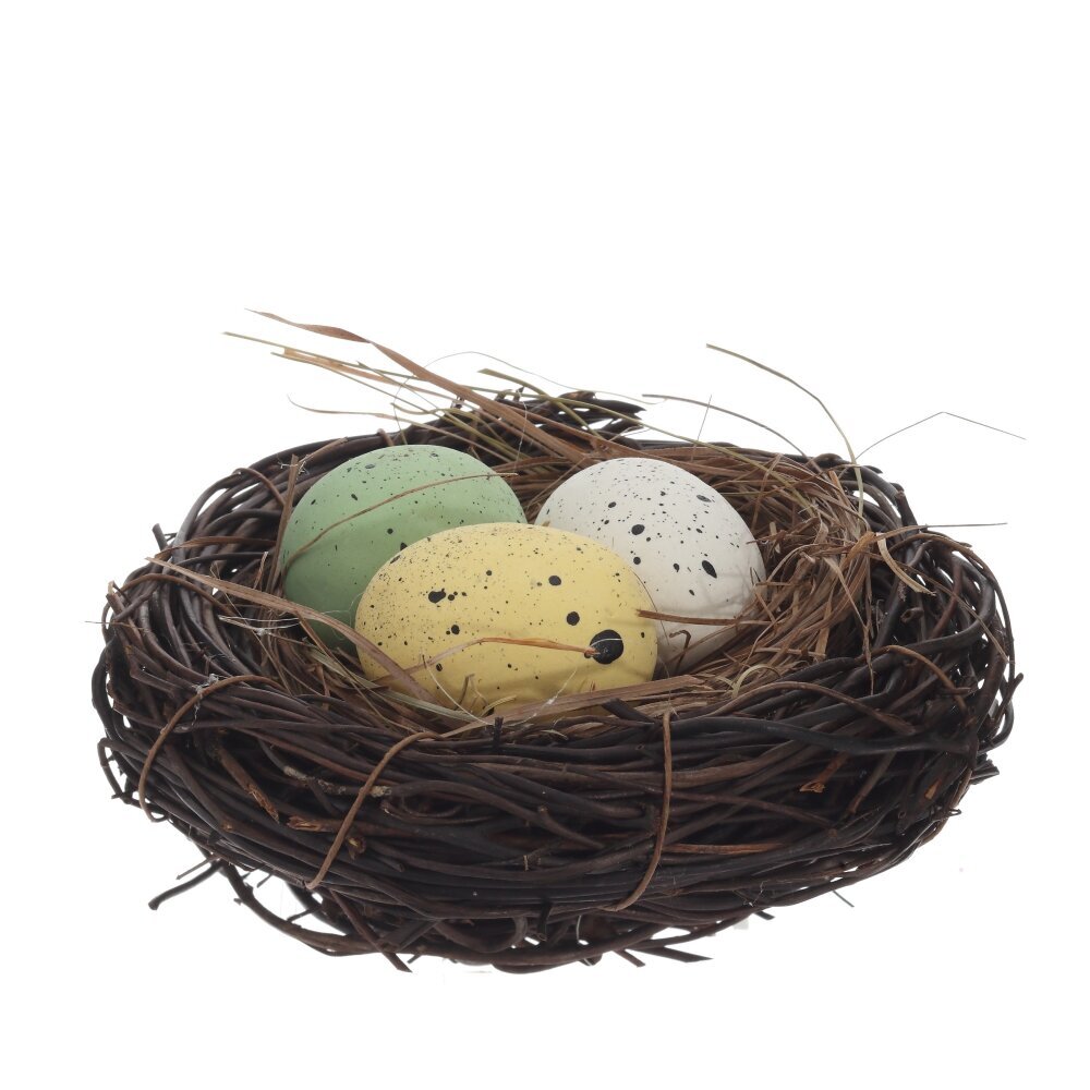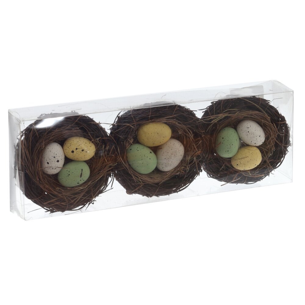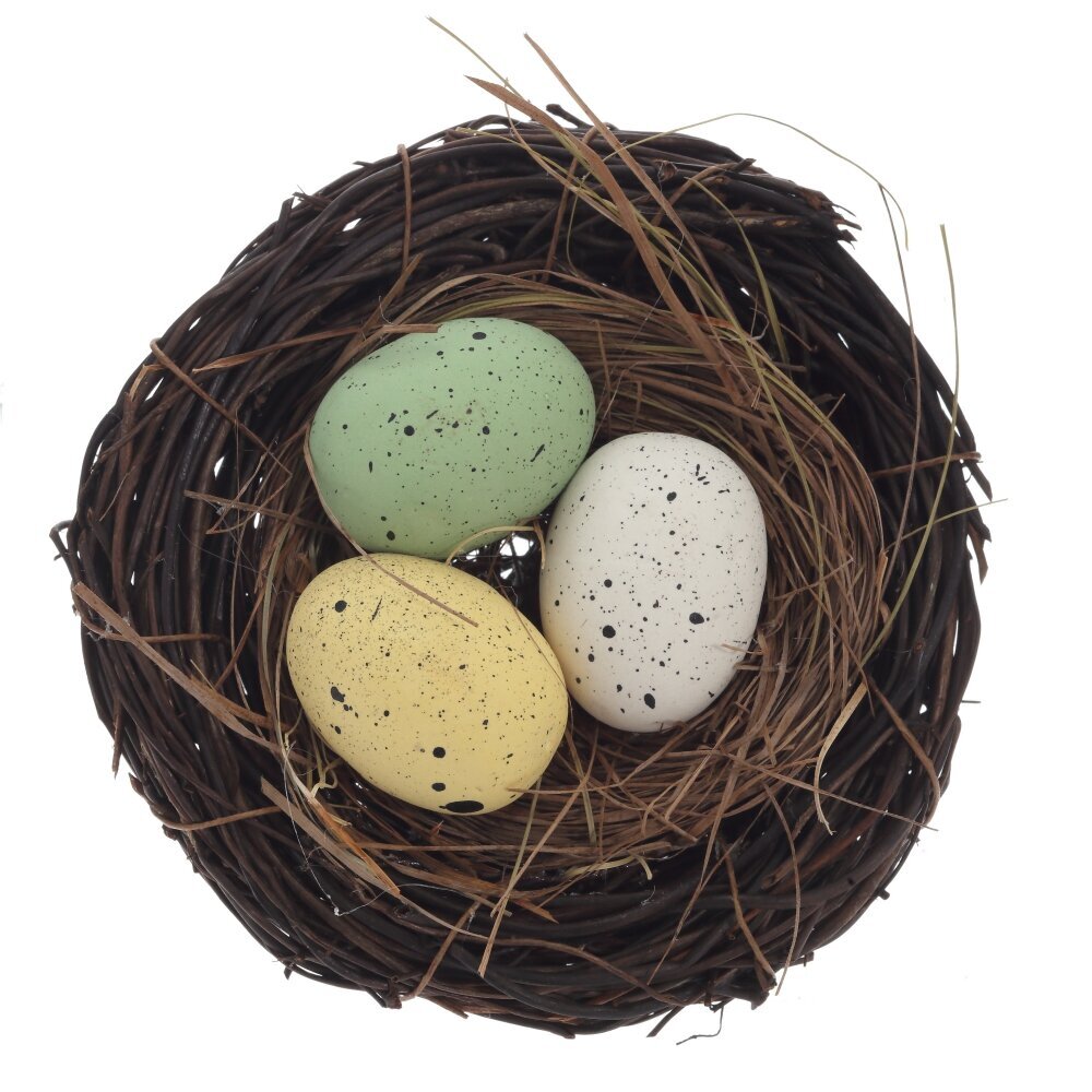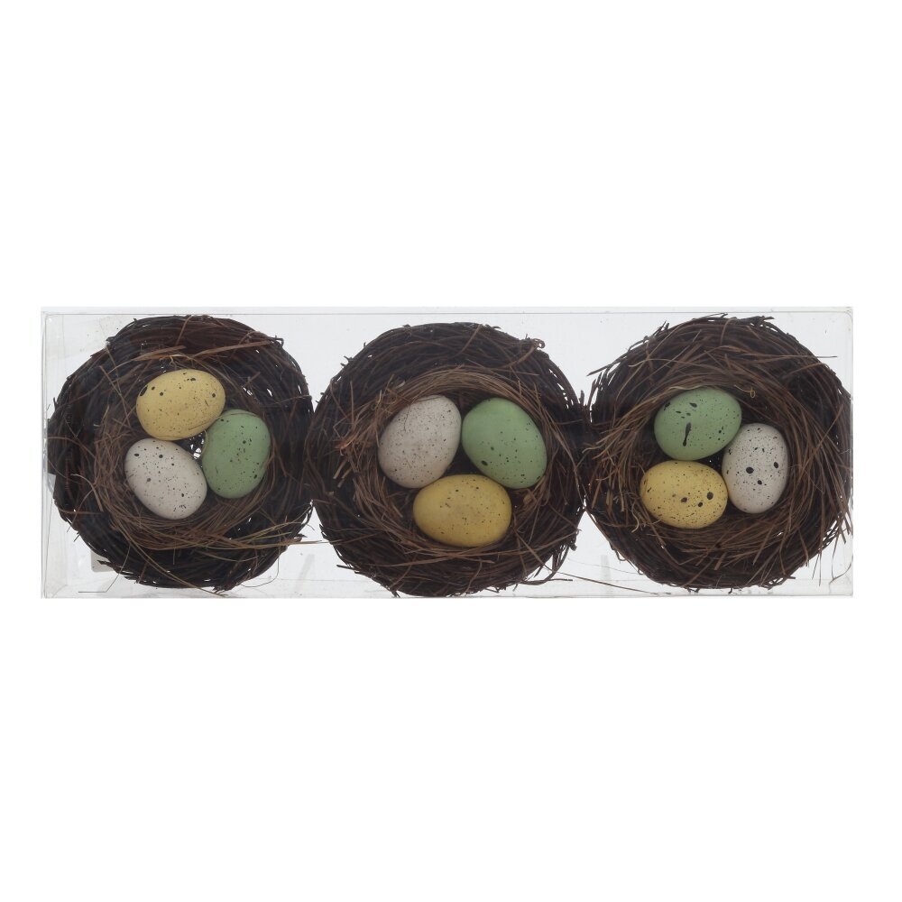 Набор из 3-х декоративных изделий «Гнездо пасхальное» — стильное украшение для весеннего интерьера и праздничного стола. В комплект входят три миниатюрных гнёздышка, выполненных из натуральных материалов, имитирующих тонкие веточки и траву. В каждом гнезде расположены небольшие пасхальные яички мягких пастельных оттенков с краплением: белые, жёлтые и зелёные. Яйца выполнены из прочных полимерных материалов, благодаря чему не бьются и долго сохраняют первоначальный вид. Набор идеально подойдёт для сервировки к Пасхе, оформления корзин, композиций, фотозон и детских праздников, создавая атмосферу уюта, весны и пробуждения природы.