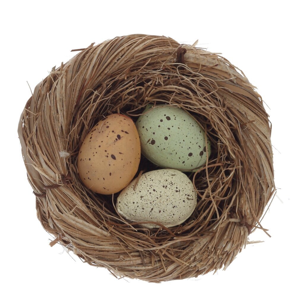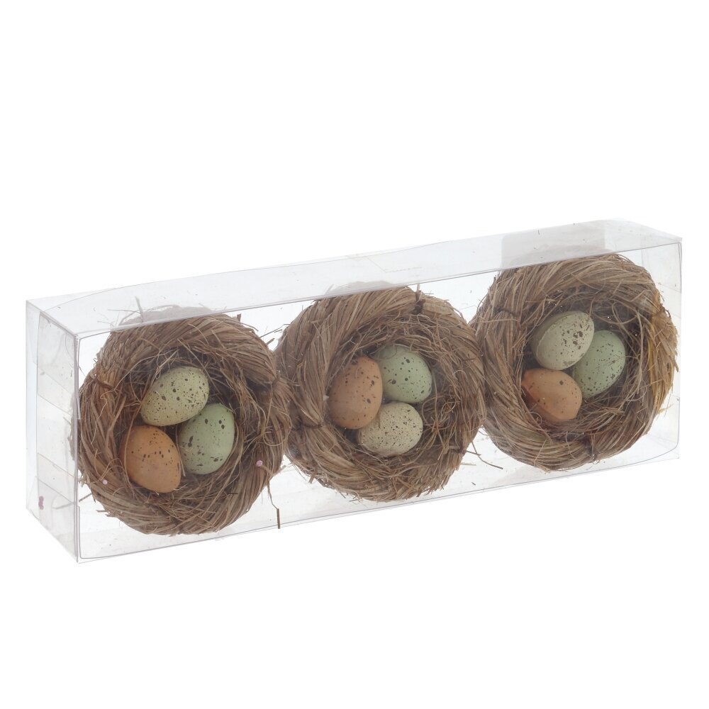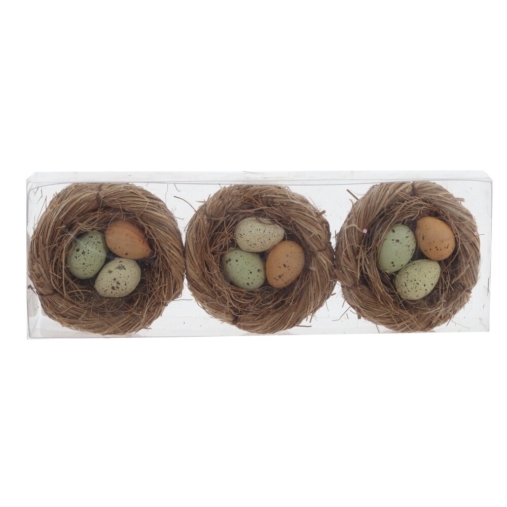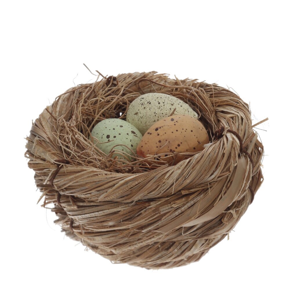 Набор из 3-х декоративных изделий «Гнездо пасхальное» — стильное украшение для весеннего интерьера и праздничного стола. В комплект входят три миниатюрных гнёздышка, выполненных из натуральных материалов, имитирующих тонкие веточки и траву. В каждом гнезде расположены небольшие пасхальные яички мягких пастельных оттенков с краплением: белые, жёлтые и зелёные. Яйца выполнены из прочных полимерных материалов, благодаря чему не бьются и долго сохраняют первоначальный вид. Набор идеально подойдёт для сервировки к Пасхе, оформления корзин, композиций, фотозон и детских праздников, создавая атмосферу уюта, весны и пробуждения природы.