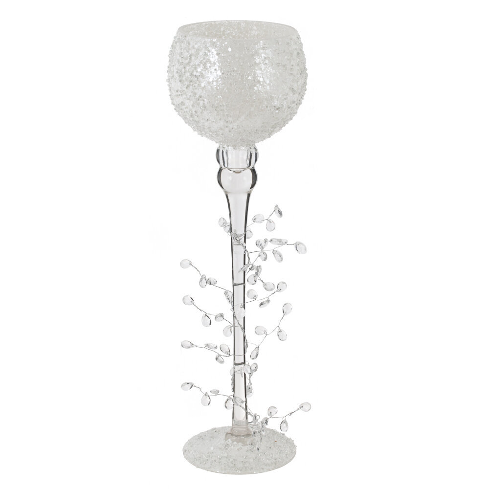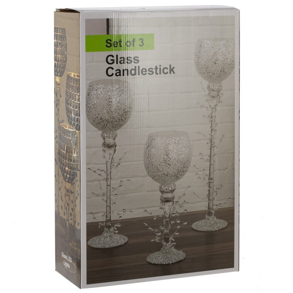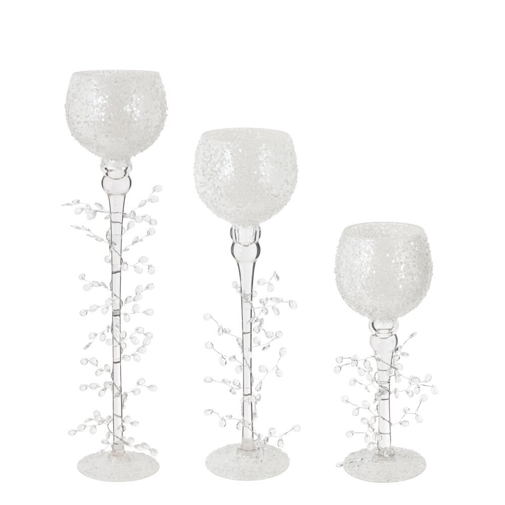Набор из 3-х стеклянных подсвечников — изящные «бокалы» на тонкой ножке, украшенной прозрачными веточками с каплями-бусинами, создающими эффект инея. Фактурные матовые чаши мягко рассеивают свет и дают теплое мерцание. Размеры: L12 ? W12 ? H30/40/50 см; разная высота позволяет составить динамичную композицию на столе или камине. Устойчивые круглые основания защищают поверхность, стекло легко очищается. Подходят для чайных свечей и небольших столбиков. Идеальны для сервировки свадьбы, новогоднего декора и уютных вечеров, привнося в интерьер изысканность и кристальную легкость.