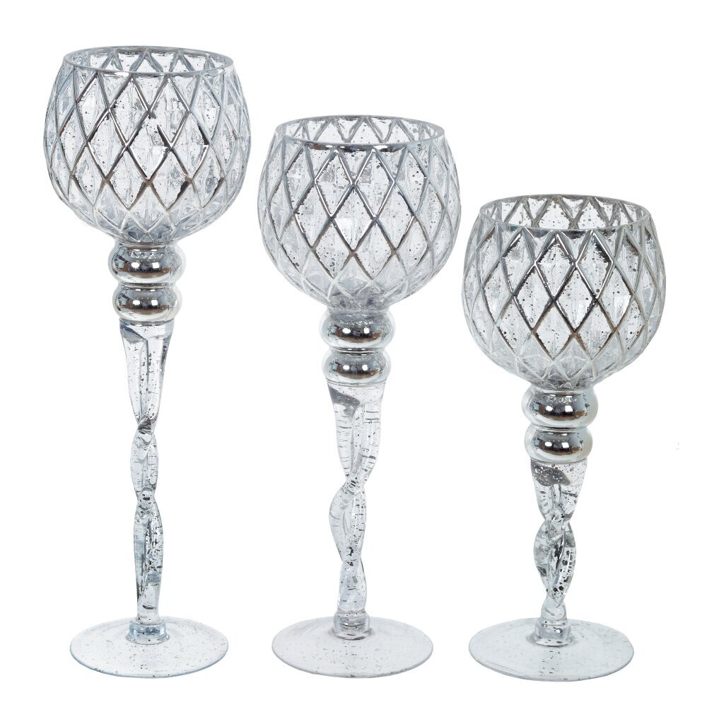 Набор из трех оригинальных стеклянных подсвечников на высоких ножках - прекрасный аксессуар для оформления праздничного стола. Он дополнит сервировку стола, подойдет для романтического вечера, или, просто украсит ваш дом. Размеры подсвечников: 13*13*40/35/30 см. Для свечи, диаметром 7 см.