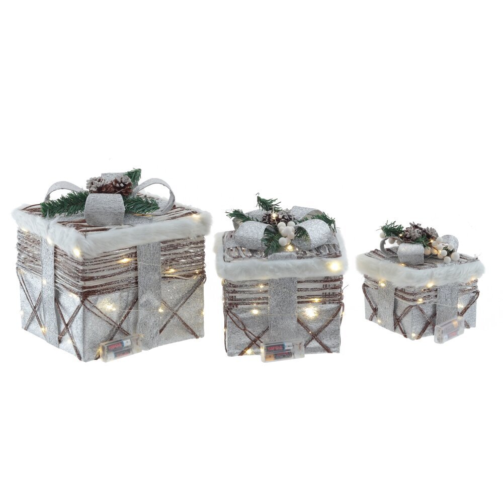 Добавить праздничные нотки в обстановку поможет набор из трех световых фигур в форме подарков. Размер большого подарка равен 27х27х30 см, среднего 22х22х25 см, маленького - 17х17х20см. Теплое сияние завораживает взгляд в ожидании праздничных чудес. Изделия работают от шести батареек АА, в каждом подарке по 2 батарейки (не прилагаются). Только для использования внутри помещений.