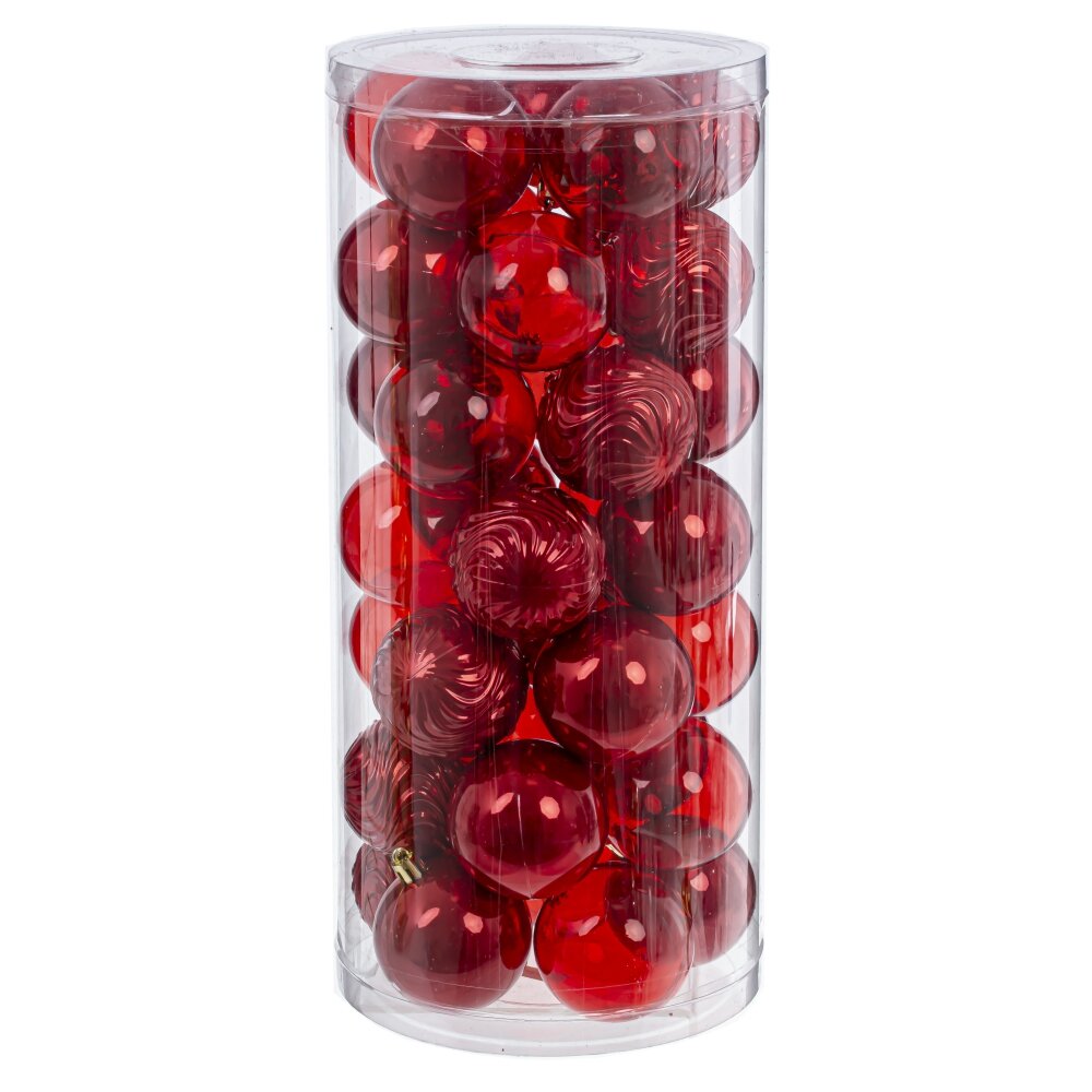 Набор новогодних украшений "Шар" включает 35 шаров диаметром 6 см в ярко-красной цветовой гамме. Эти изысканные шары разделены на 3 вида разных фактур: гладкий прозрачный, глянцевый и рельефный. Они прекрасно сочетаются между собой, создавая волшебную атмосферу и олицетворяя красоту новогодних праздников. Удобная прозрачная упаковка размером 16x16x36 см.