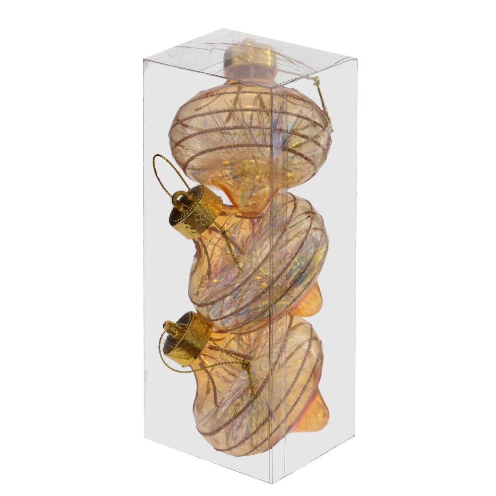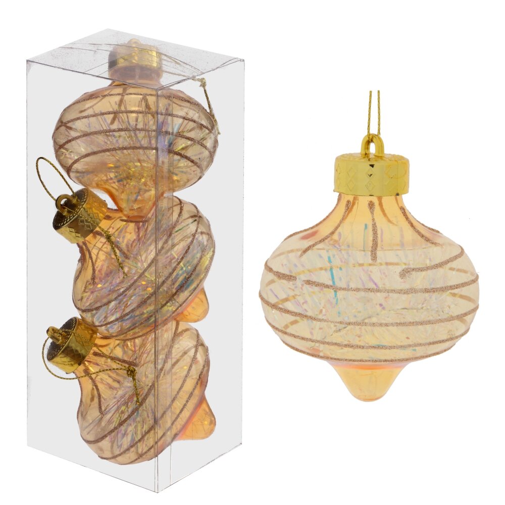 Набор из трех елочных шаров в форме Луковки Украшения прекрасно смотрятся в убранстве новогодней ели. Поставляются в прозрачной пластиковой упаковке.