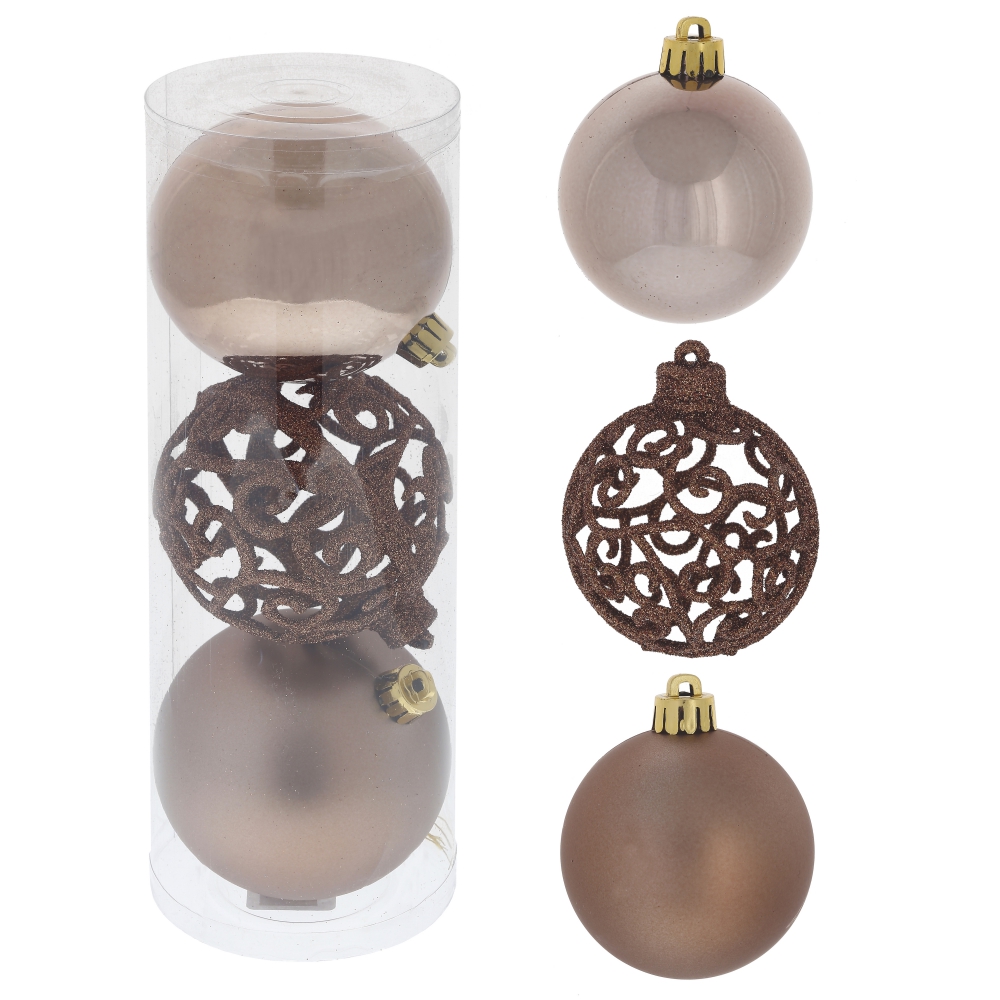 Набор из 3-х елочных шаров, диаметром 8 см, выполнен в единой цветовой гамме. В составе набора - пластиковые шары разной фактуры - глянцевые, матовые и с глиттером ажурные. Прекрасно смотрятся в убранстве новогодней ели. Поставлются в прозрачной пластиковой упаковке.