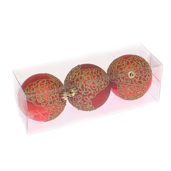Набор из 3-х новогодних украшений (матовые и глянцевые елочные шары с золотым узором) изготовлен из полимерных материалов, в подарочной упаковке