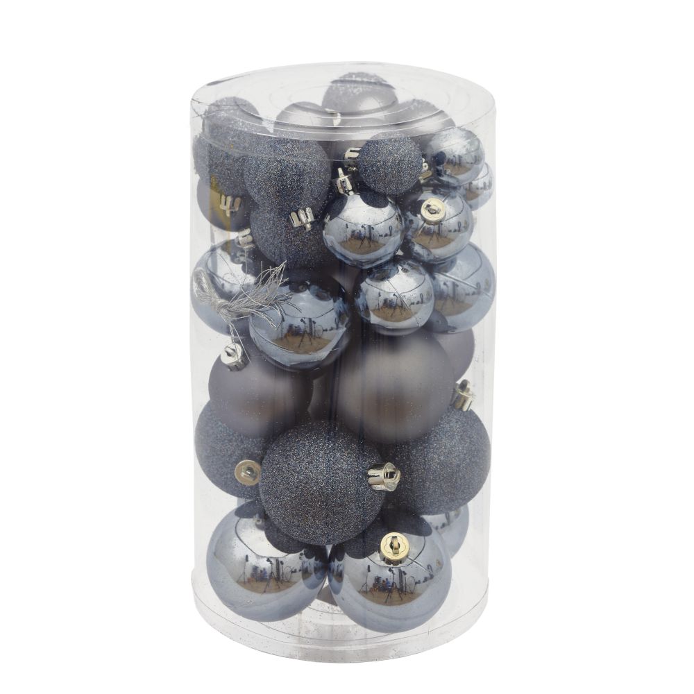 Набор из сорока елочных шаров, диаметром 6/5/4/3 см, выполнен в единой цветовой гамме. В составе набора - пластиковые шары разной фактуры -глянцевые, матовые и с глиттером. Прекрасно смотрятся в убранстве новогодней ели. Поставляются в прозрачной пластиковой упаковке.