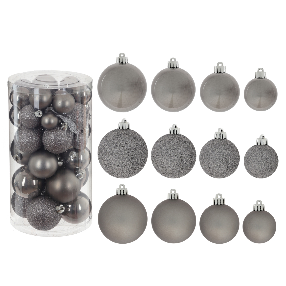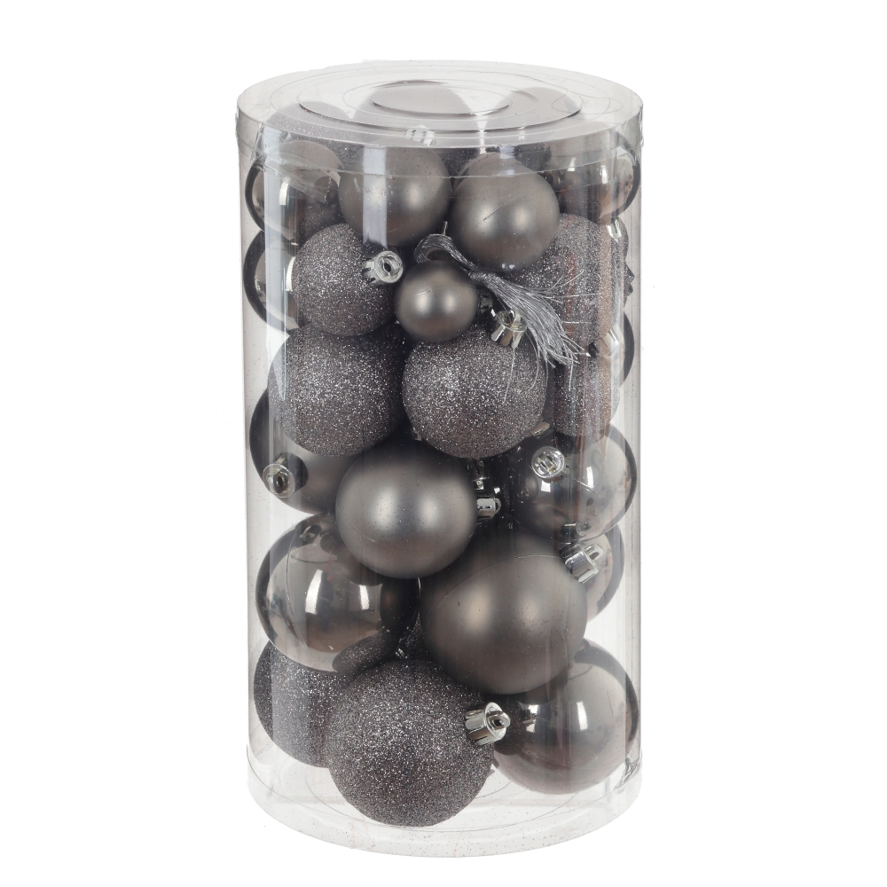 Набор из 40-ка елочных шаров выполнен в единой цветовой гамме. В составе набора - пластиковые шары разной фактуры - глянцевые, матовые и с глиттером. Прекрасно смотрятся в убранстве новогодней ели. Поставляются в прозрачном пластиковом контейнере.