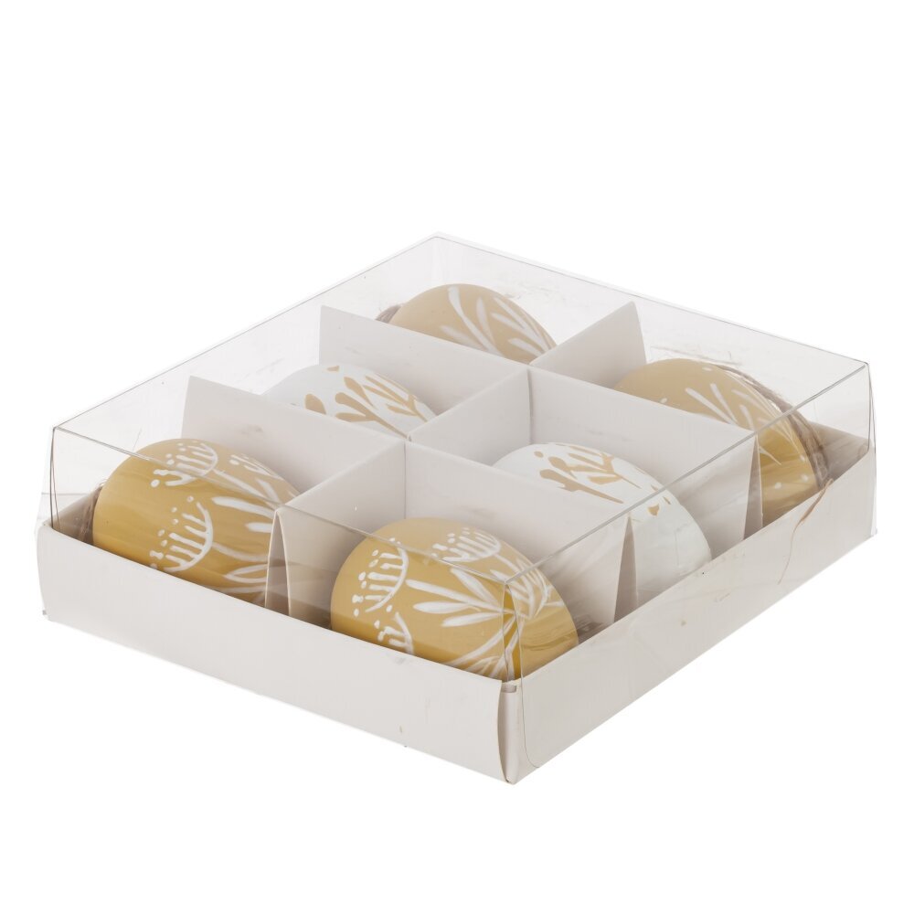 Этот набор из 6 декоративных подвесных яиц—прекрасный элемент декора для любого интерьера. Изделия выполнены из полимерных материалов и имеют размер 3,5*5,5 см. Они оформлены в нежных пастельных тонах: белом и зеленом, с изящными рисунками в виде растительных мотивов. Благодаря стильному дизайну и натуральным оттенкам, эти подвески подойдут для украшения дома к Пасхе, зимним праздникам или просто для создания уютной атмосферы. Каждое яйцо снабжено веревочной петлей, что облегчает их развешивание на ветках, венках или других декоративных элементах.