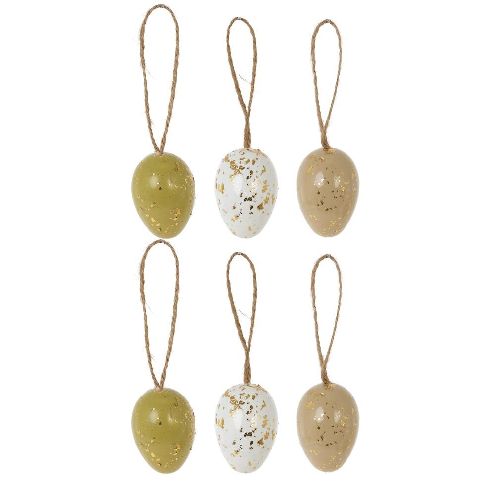 Набор декоративных подвесных изделий «Яйцо пасхальное» из 6 штук станет стильным акцентом вашей пасхальной композиции. Яйца выполнены из полимерных материалов и украшены золотистыми вкраплениями. В набор входят изделия трёх оттенков – оливковый, белый и бежевый, по два каждого цвета. Каждое яйцо оснащено петлёй из джута, что позволяет легко подвесить их на пасхальное дерево, веточки, окна, дверные ручки или использовать в настольных украшениях и подарочных корзинах. Лёгкие, безопасные и долговечные, эти подвески помогут создать уютную атмосферу праздника и подойдут для многократного использования из года в год.