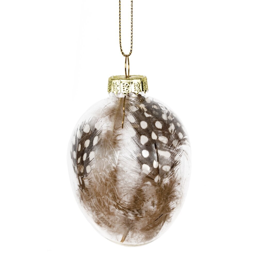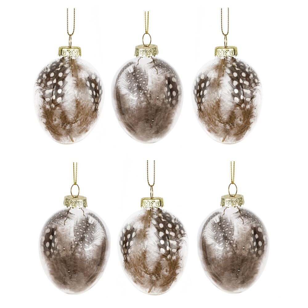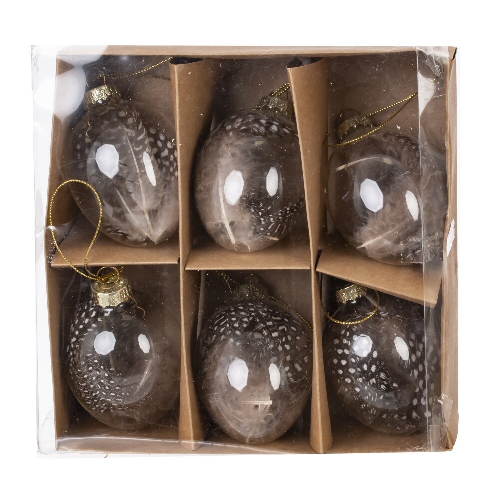 Набор из 6-ти декоративных подвесных изделий «Яйцо пасхальное» – изысканное украшение для пасхального декора дома, витрины или праздничной композиции. Каждое яйцо выполнено из прозрачного стекла и украшено натуральными перьями внутри, благодаря чему создаётся ощущение лёгкости и воздушности. Золотистый колпачок и тонкая подвесная нить позволяют легко разместить украшения на веточках, пасхальном деревце, люстре или оконном проёме. Стеклянные яйца гармонично сочетаются с натуральными материалами, живыми цветами и традиционными пасхальными атрибутами, подчёркивая атмосферу весеннего обновления и уюта.