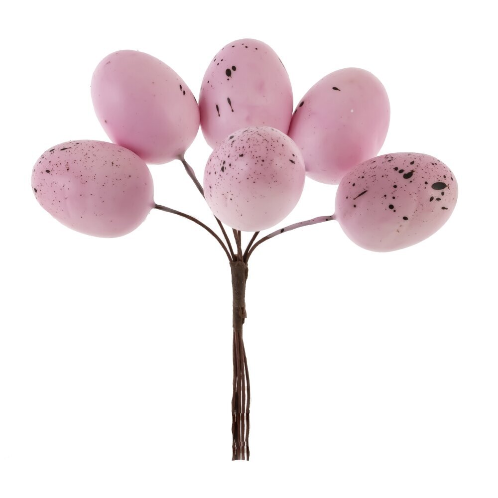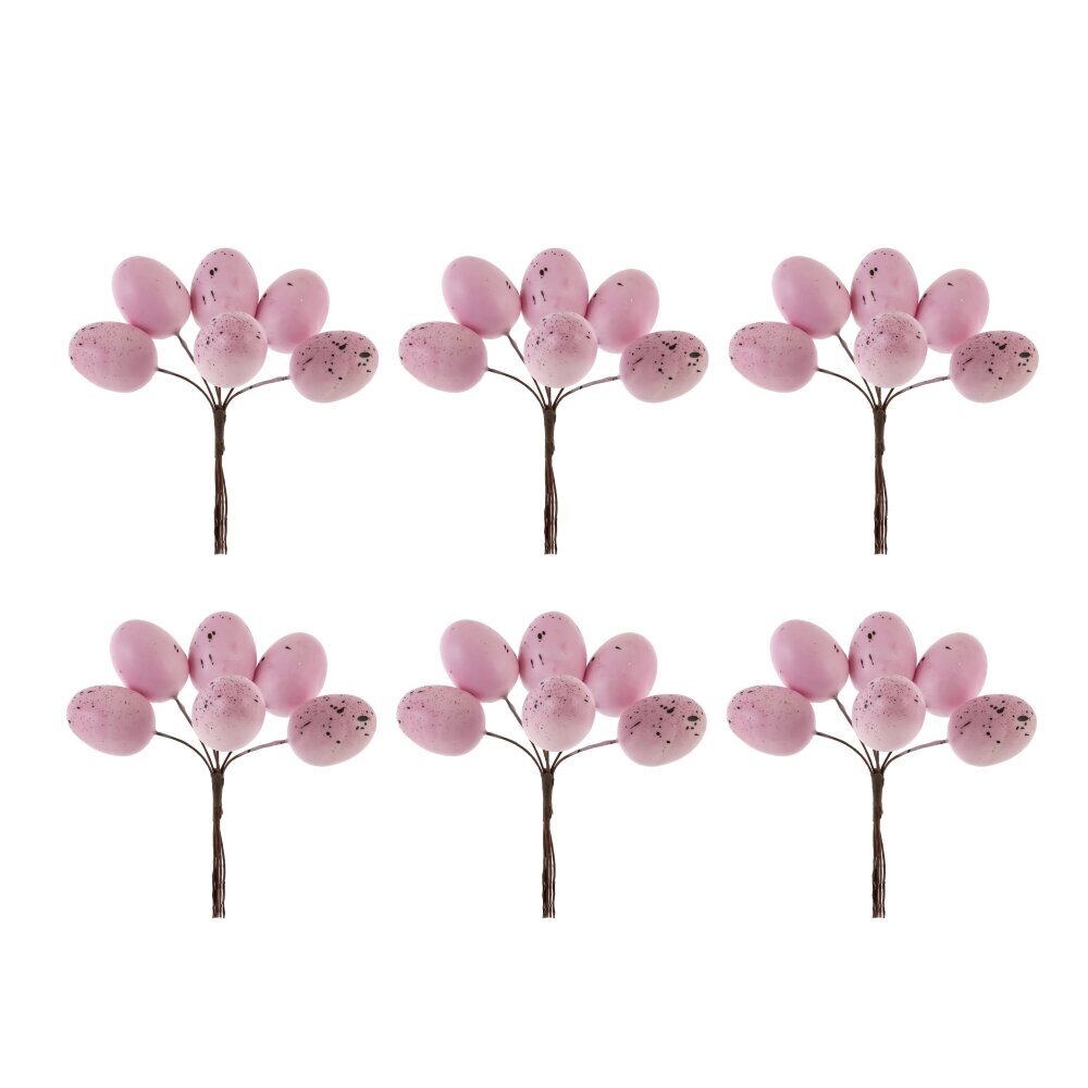 Набор из 6-ти декоративных изделий «Яйца пасхальные» — яркое украшение для праздничного интерьера. Каждое изделие представляет собой мини-букет из 6 небольших розовых яиц с крапинками, закреплённых на гибких металлических ножках. Композиции удобно вставлять в корзины, пасхальные композиции, флористические букеты, венки и декоративные горшки. Лёгкие и износостойкие полимерные материалы сохраняют форму и цвет, не боятся случайных падений и подходят для многократного использования из года в год. Такой набор поможет быстро создать атмосферу весеннего праздника дома, в офисе, витрине магазина или детском саду.