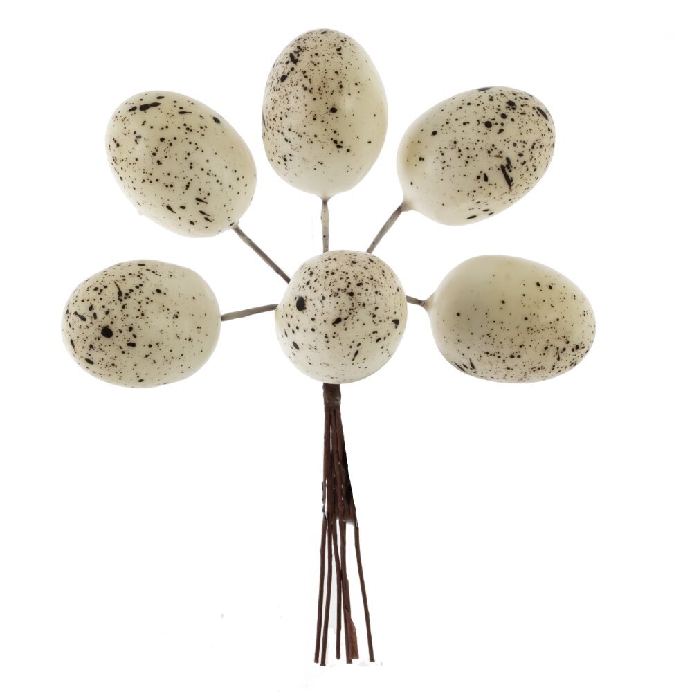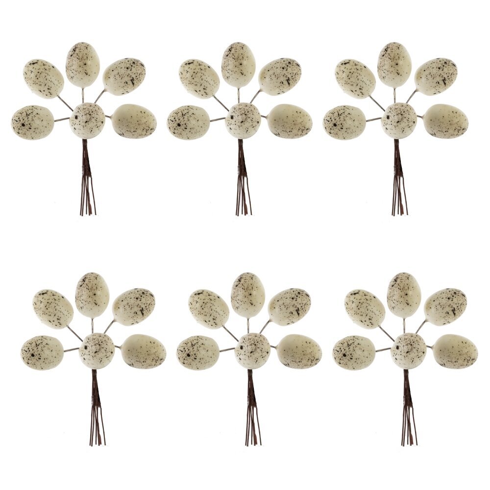 Набор из 6-ти декоративных изделий «Яйца пасхальные» — яркое украшение для праздничного интерьера. Каждое изделие представляет собой мини-букет из 6 небольших бежевых яиц с крапинками, закреплённых на гибких металлических ножках. Композиции удобно вставлять в корзины, пасхальные композиции, флористические букеты, венки и декоративные горшки. Лёгкие и износостойкие полимерные материалы сохраняют форму и цвет, не боятся случайных падений и подходят для многократного использования из года в год. Такой набор поможет быстро создать атмосферу весеннего праздника дома, в офисе, витрине магазина или детском саду.