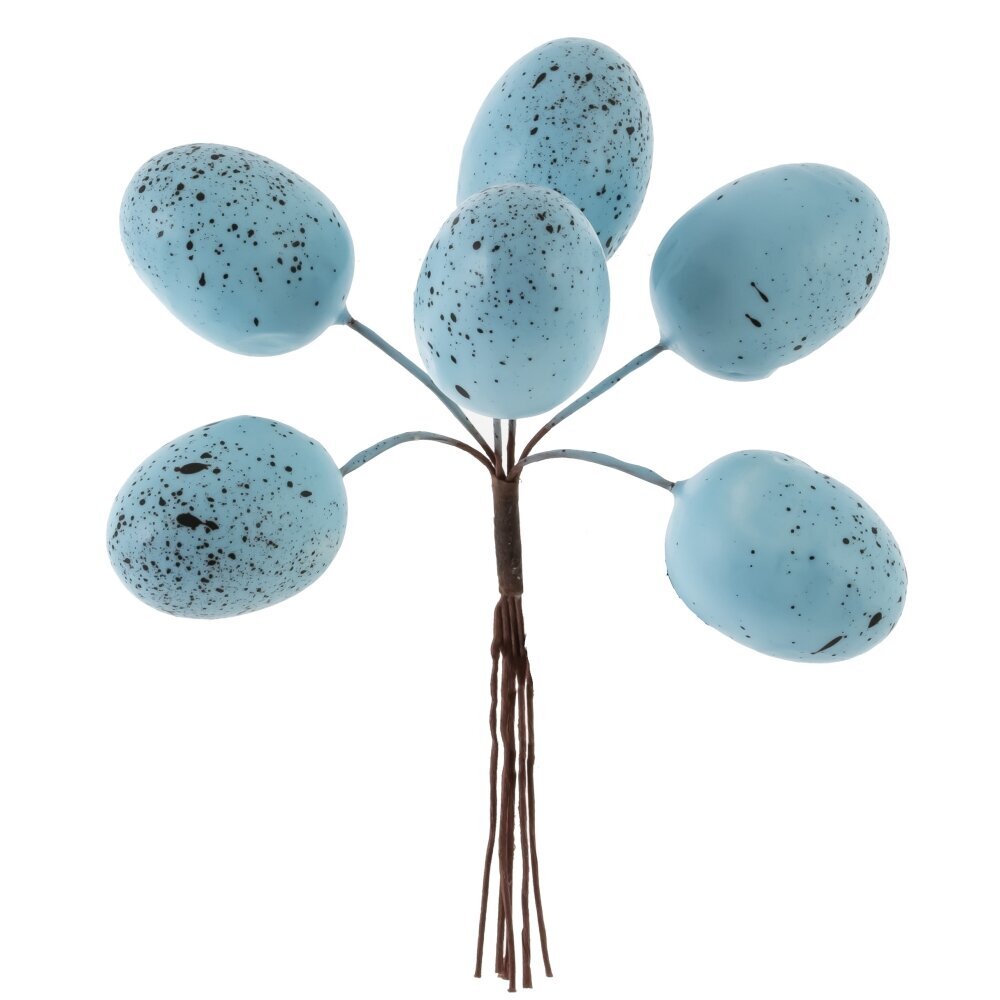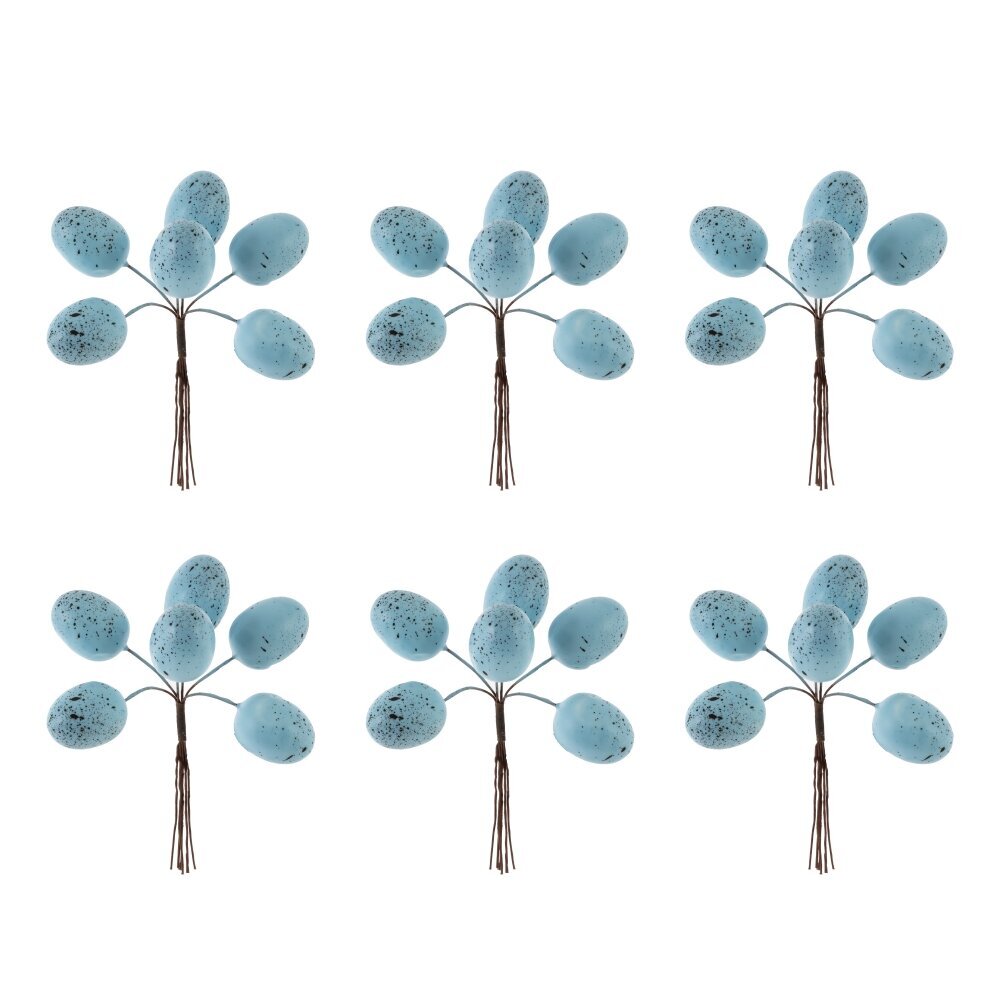 Набор из 6-ти декоративных изделий «Яйца пасхальные» — яркое украшение для праздничного интерьера. Каждое изделие представляет собой мини-букет из 6 небольших голубых яиц с крапинками, закреплённых на гибких металлических ножках. Композиции удобно вставлять в корзины, пасхальные композиции, флористические букеты, венки и декоративные горшки. Лёгкие и износостойкие полимерные материалы сохраняют форму и цвет, не боятся случайных падений и подходят для многократного использования из года в год. Такой набор поможет быстро создать атмосферу весеннего праздника дома, в офисе, витрине магазина или детском саду.