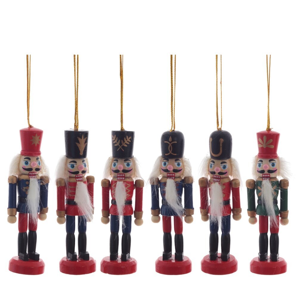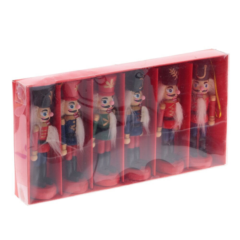 Этот комплект из шести деревянных новогодних украшений в форме Щелкунчиков станет великолепным украшением вашей ёлки. Каждый Щелкунчик в наборе отличается своим уникальным нарядом, а борода и волосы выполнены из искусственного меха, что добавляет каждой фигурке особого шарма. Эти украшения станут ярким и оригинальным элементом в вашей новогодней коллекции! Они упакованы в стильную коробку с прозрачной крышкой, что делает их отличным подарком для ваших близких.