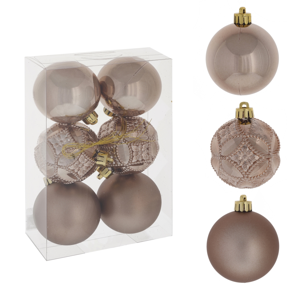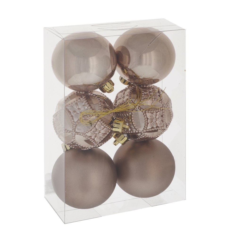 Набор из 6-ти новогодних украшений (коричневые елочные шары) изготовлен из полимерных материалов, в подарочной упаковке