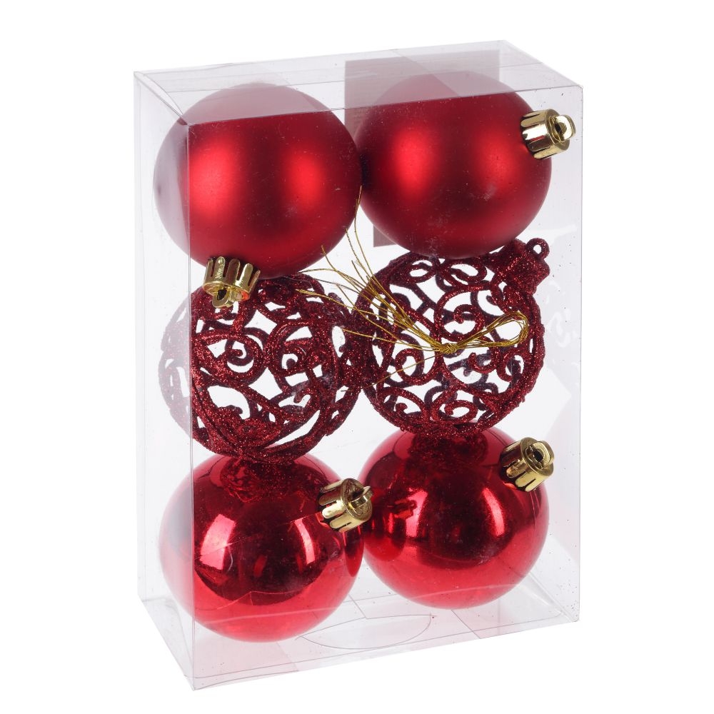 Набор из 6-ти елочных шаров выполнен в единой цветовой гамме. В составе набора - пластиковые украшения разной фактуры - глянцевые, матовые и ажурные с глиттером. Прекрасно смотрятся в убранстве новогодней ели. Поставляются в прозрачной пластиковой упаковке.