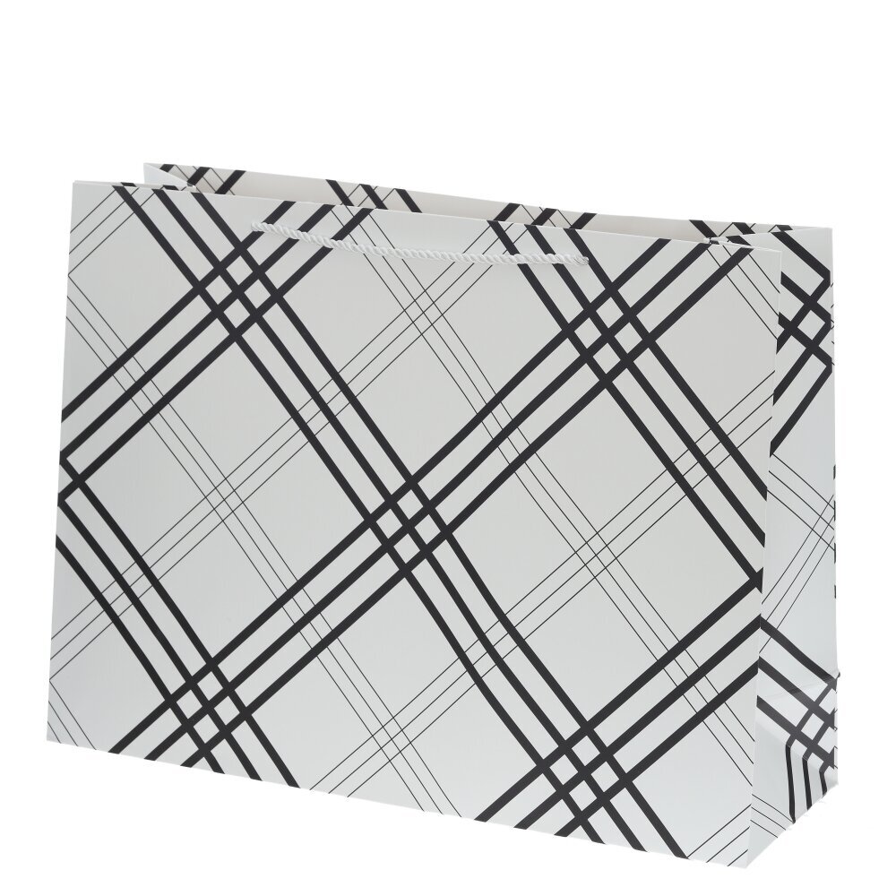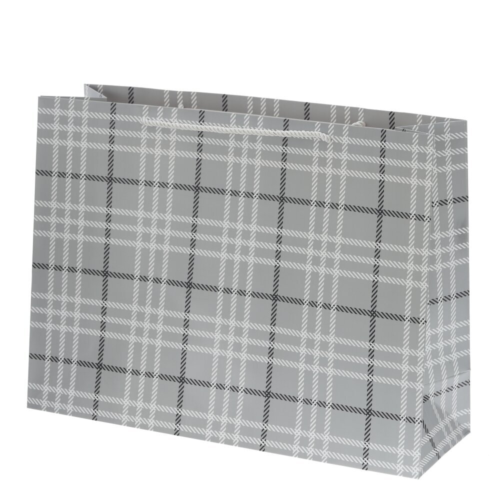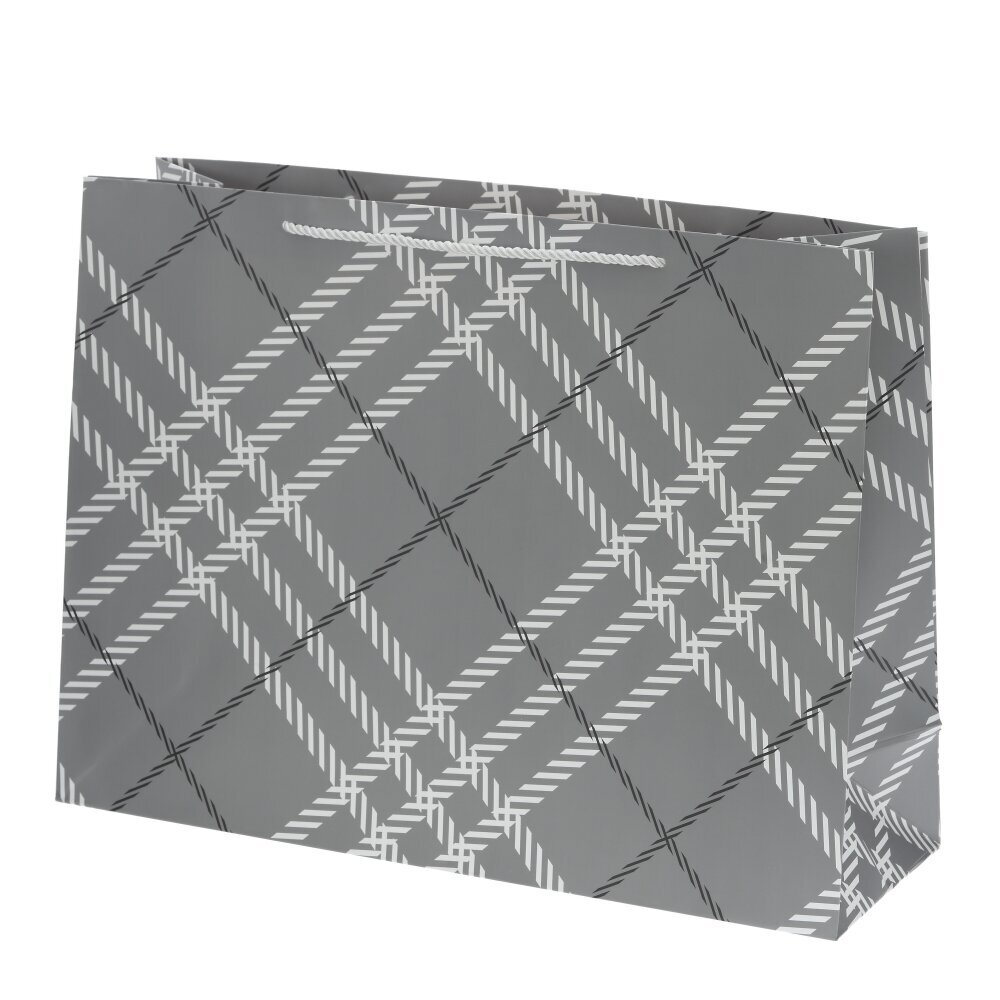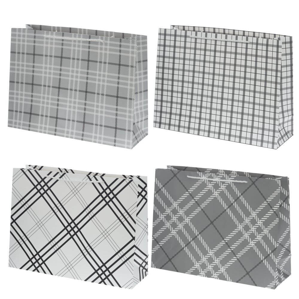 Подарочные пакеты размера L с лаконичным клетчатым рисунком в серо-бело-черной гамме. В наборе 4 варианта дизайна, что позволяет подобрать оформление под любой повод и адресата. Изготовлены из плотной бумаги 250 г/м?: материал держит форму, не просвечивает и аккуратно выглядит. Удобные ручки позволяют комфортно нести содержимое. Габариты одного пакета L47 ? W15 ? H35 см — оптимальны для одежды, книг, коробок с подарками и сувениров средних размеров. Прямоугольное дно и боковые фальцы обеспечивают устойчивость и вместимость. Универсальная монохромная палитра подходит как для женских, так и для мужских подарков и уместна на любые праздники.