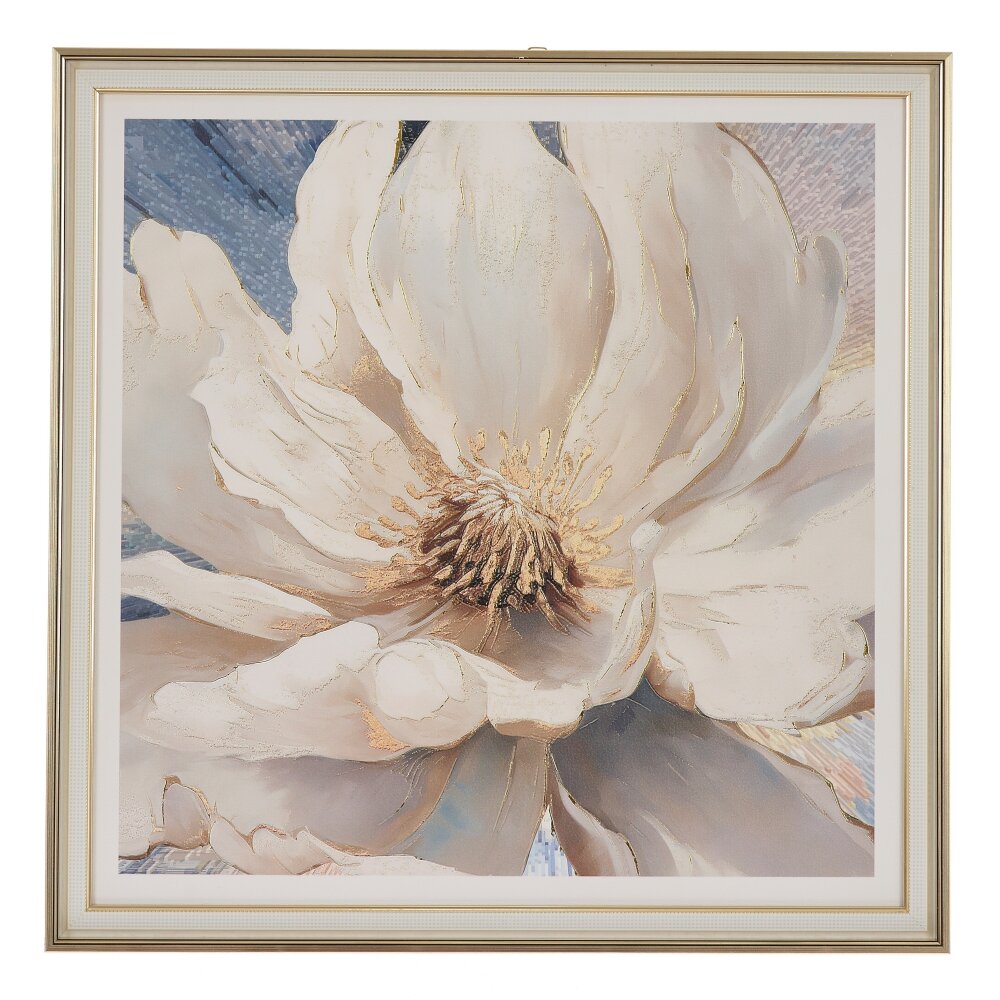 Элегантное настенное панно с изображением крупного белого цветка станет выразительным акцентом в любом интерьере. Нежные лепестки в пастельных бежево-кремовых тонах эффектно выделяются на мягком фоновом градиенте, создавая ощущение объёма и лёгкости. Тонкие золотистые блики добавляют композиции утончённого сияния и делают панно особенно красивым при дневном и вечернем освещении. Классическая светлая рама с аккуратным профилем завершает образ и позволяет легко вписать изделие как в современный, так и в классический стиль оформления. Панно идеально подойдёт для гостиной, спальни, столовой или зоны отдыха, визуально расширит пространство и наполнит его светом и гармонией.