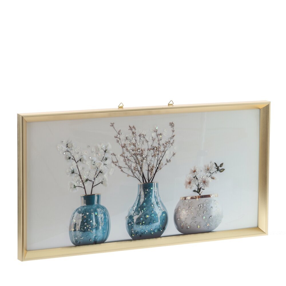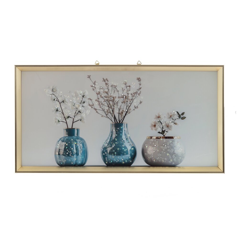 Настенное панно с кристальным декором – изысканный акцент для современного интерьера. На светлом фоне изображены три изящные вазы с нежными веточками цветов, украшенные россыпью сверкающих кристаллов. Объёмные блиkи создают эффект живого сияния и делают композицию более глубокой и выразительной. Лаконичная прямоугольная форма и тонкая рамка благородного золотистого оттенка легко впишутся в гостиную, спальню, прихожую или офис. Такое панно станет стильным украшением стены, визуально освежит пространство и подчеркнёт утончённый вкус владельца. Отличный выбор для подарка и для декора дома.