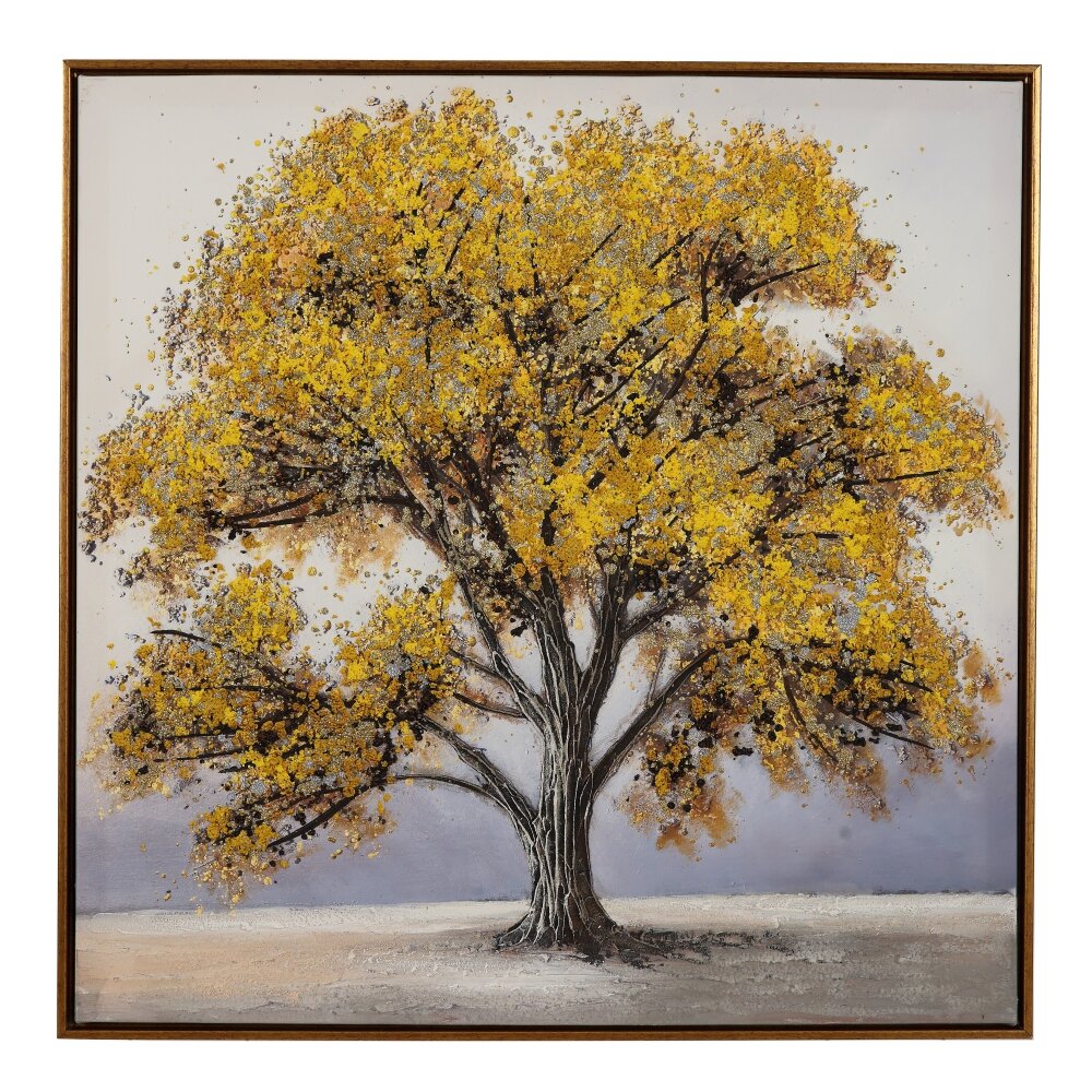 Настенное панно с изображением раскидистого дерева в золотисто-жёлтой листве станет ярким акцентом любого интерьера. Фактура кроны создаёт ощущение живой поверхности и притягивает взгляд. Нейтральный фон в мягких серо-бежевых тонах подчёркивает насыщенный цвет листьев и делает композицию особенно выразительной. Тонкая рама в благородном оттенке золота аккуратно обрамляет изображение и придаёт ему завершённый, декоративный вид. Панно гармонично впишется в гостиную, спальню, столовую или офис, подчеркнёт современный, классический или экостиль и создаст атмосферу уюта и спокойствия в помещении.