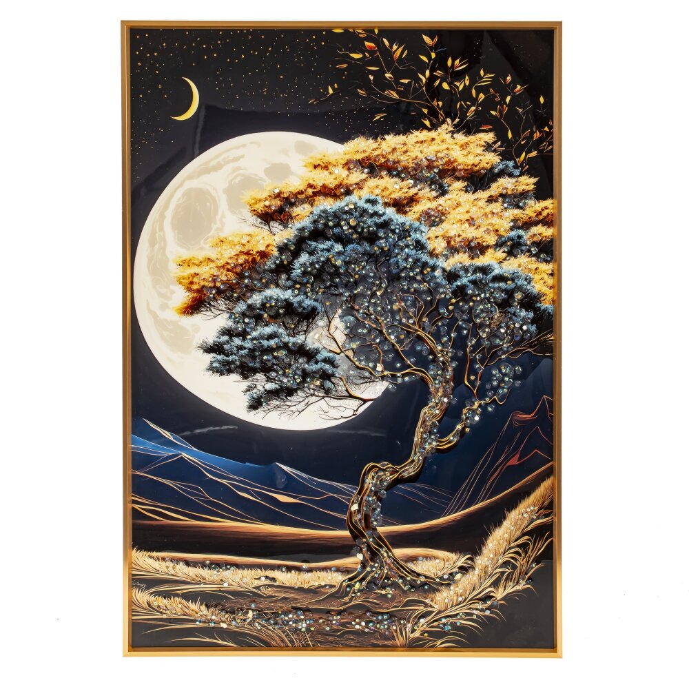Настенное панно с кристальным декором – элегантный декоративный элемент, который станет изысканным акцентом в интерьере. Размеры изделия – 40x3,5x60 см, что позволяет гармонично разместить его в гостиной, спальне или кабинете. Композиция выполнена в роскошных оттенках с изображением дерева на фоне полной луны, создавая атмосферу уюта и таинственности. Декорированные кристаллами элементы придают панно эффект мерцания, переливаясь при попадании света. Стильная золотая рамка дополняет композицию, подчеркивая её изысканность. Отличный выбор для украшения дома или оригинальный подарок.