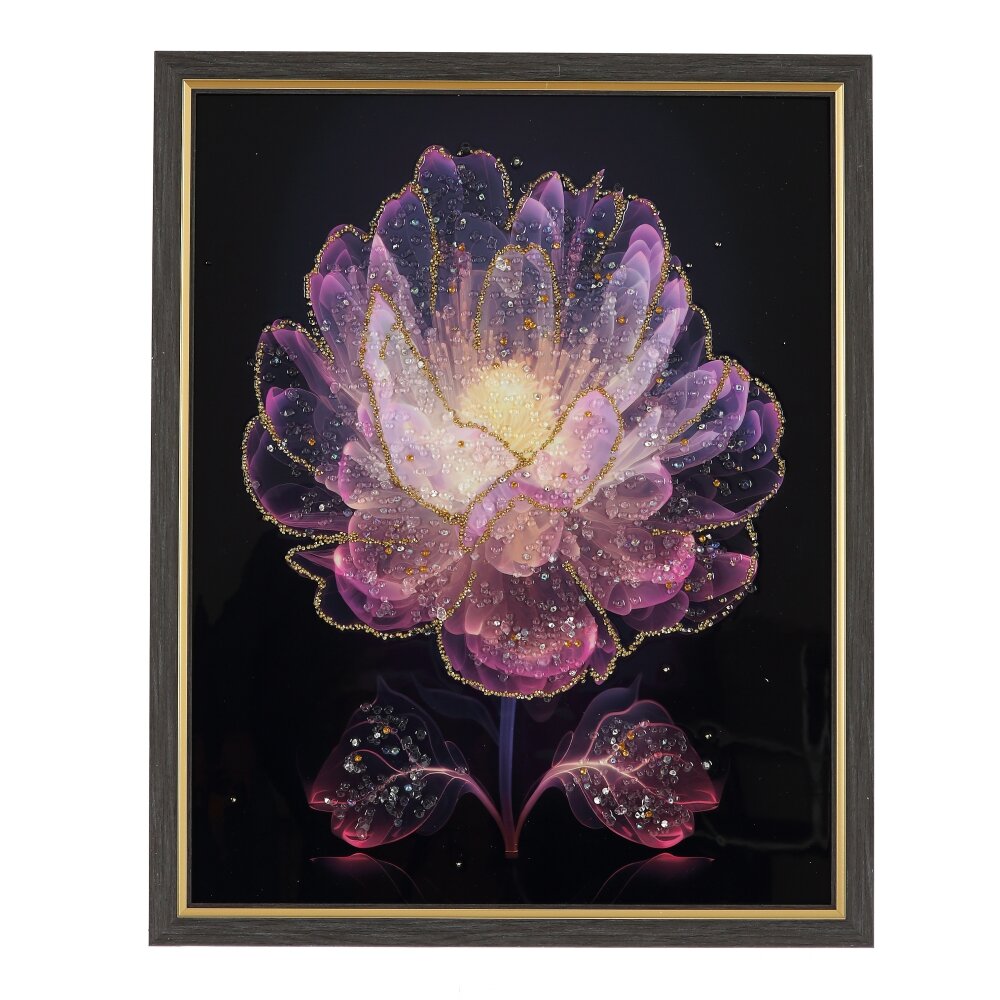 Настенное панно с кристальным декором – эффектное украшение интерьера, создающее ощущение легкого сияния и глубины. На глянцевой черной основе изображен крупный фантазийный цветок в сиренево?розовой гамме, края лепестков и сердцевина богато декорированы мерцающими кристаллами и блестками. Объемный рисунок словно подсвечен изнутри, благодаря чему панно красиво переливается при любом освещении.