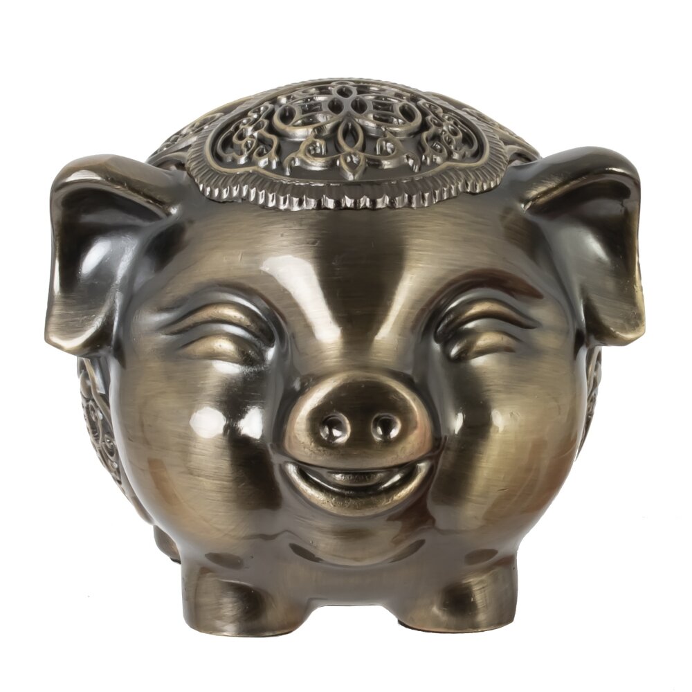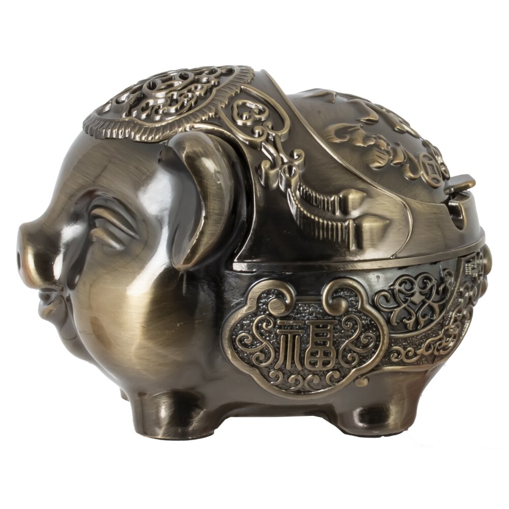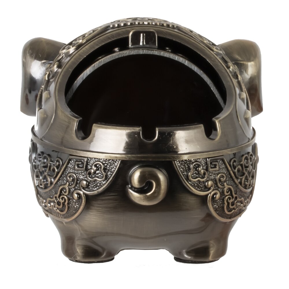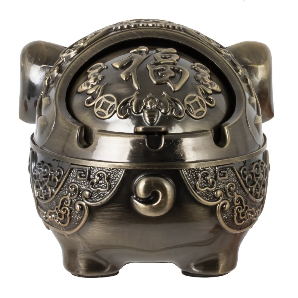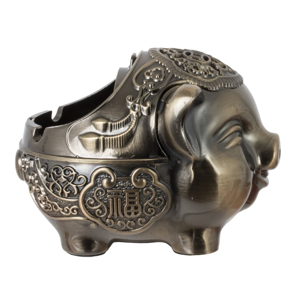 Оригинальная металлическая пепельница, выполненная в форме улыбающейся свиньи. Изделие имеет гладкую, отполированную поверхность с благородным бронзовым оттенком, что придаёт ему изысканный и стильный вид. Особое внимание привлекает верхняя часть головы, украшенная ажурным орнаментом, где и располагается основная функциональная часть пепельницы?—?отверстие для пепла и сигарет. Эта пепельница не только служит практичным предметом для курящих, но и является интересным элементом декора, способным оживить интерьер гостиной, рабочего кабинета или даже кафе. Благодаря необычной форме и качественному металлу, изделие будет долговечным и простым в уходе. Такая пепельница может стать отличным подарком для коллекционеров необычных вещей или любителей оригинального декора.