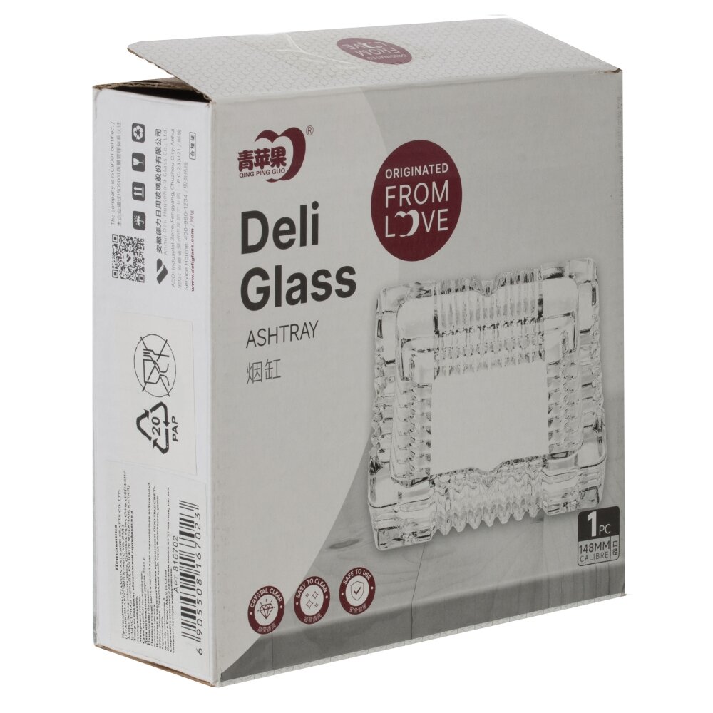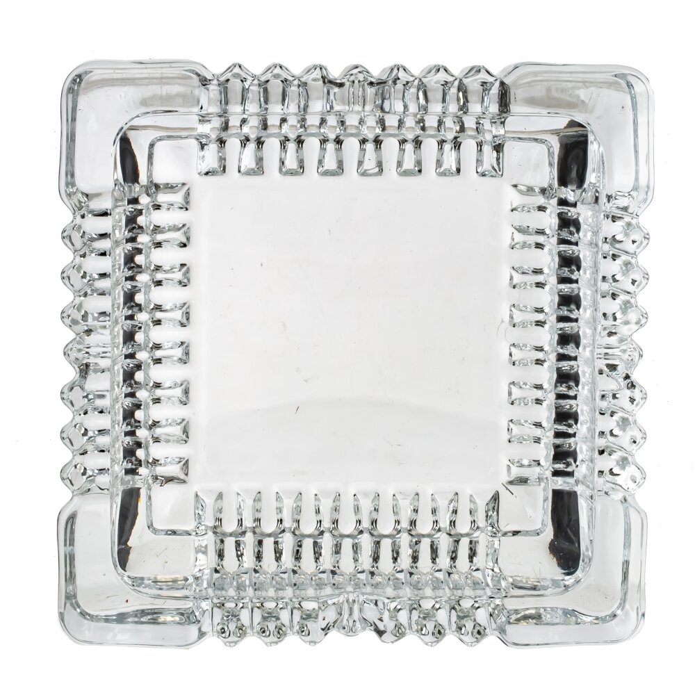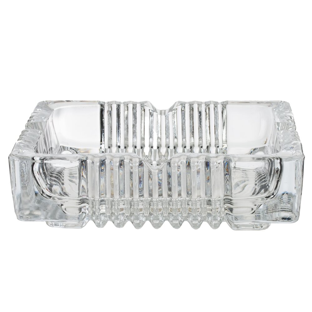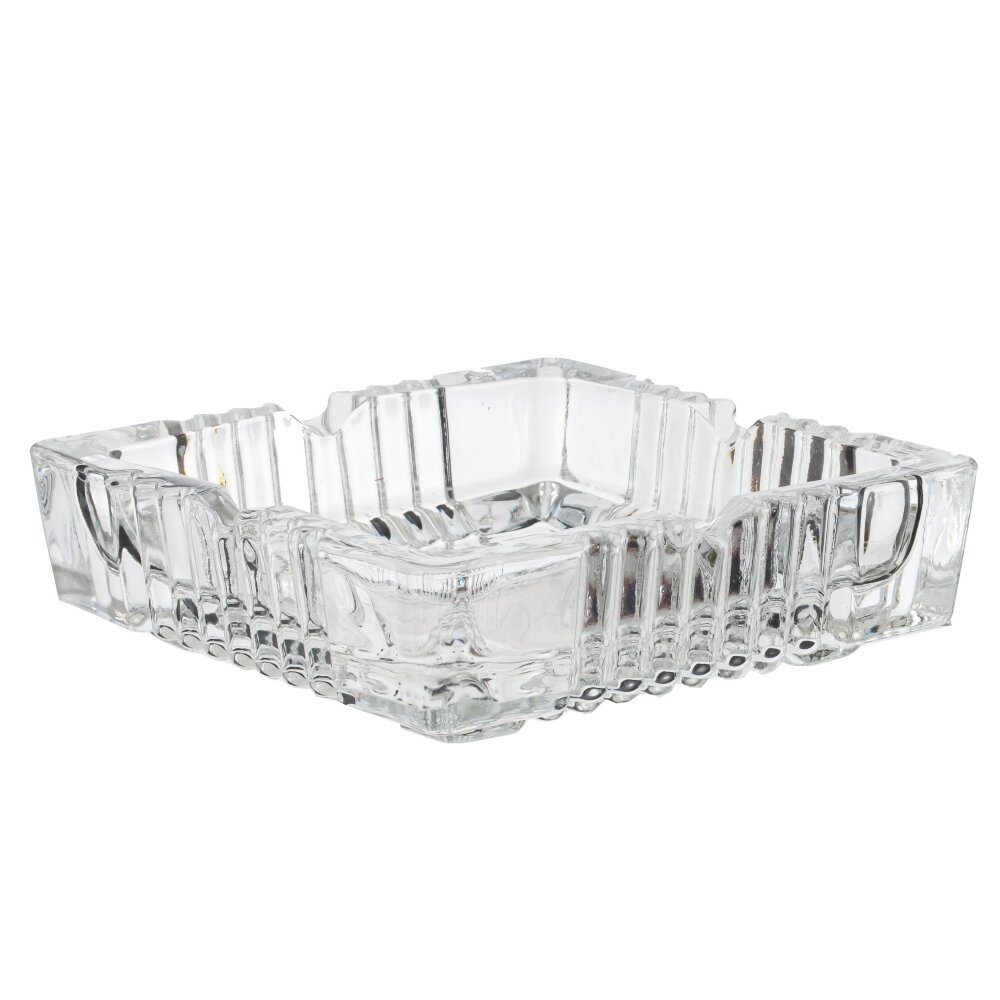 Пепельница из прозрачного, толстого стекла. По периметру — выраженный рельеф с вертикальными ребрами, создающими игру света и придающими предмету эффект кристаллической огранки. В бортиках предусмотрены выемки для удобного размещения сигарет. Масса и широкое основание обеспечивают устойчивость на столе, гладкое дно не царапает поверхность. Пепельница легко моется, не впитывает запахи и подходит для дома, офиса, бара или террасы. Универсальный дизайн сочетается как с классическим, так и с современным интерьером, добавляя аккуратный, лаконичный акцент.