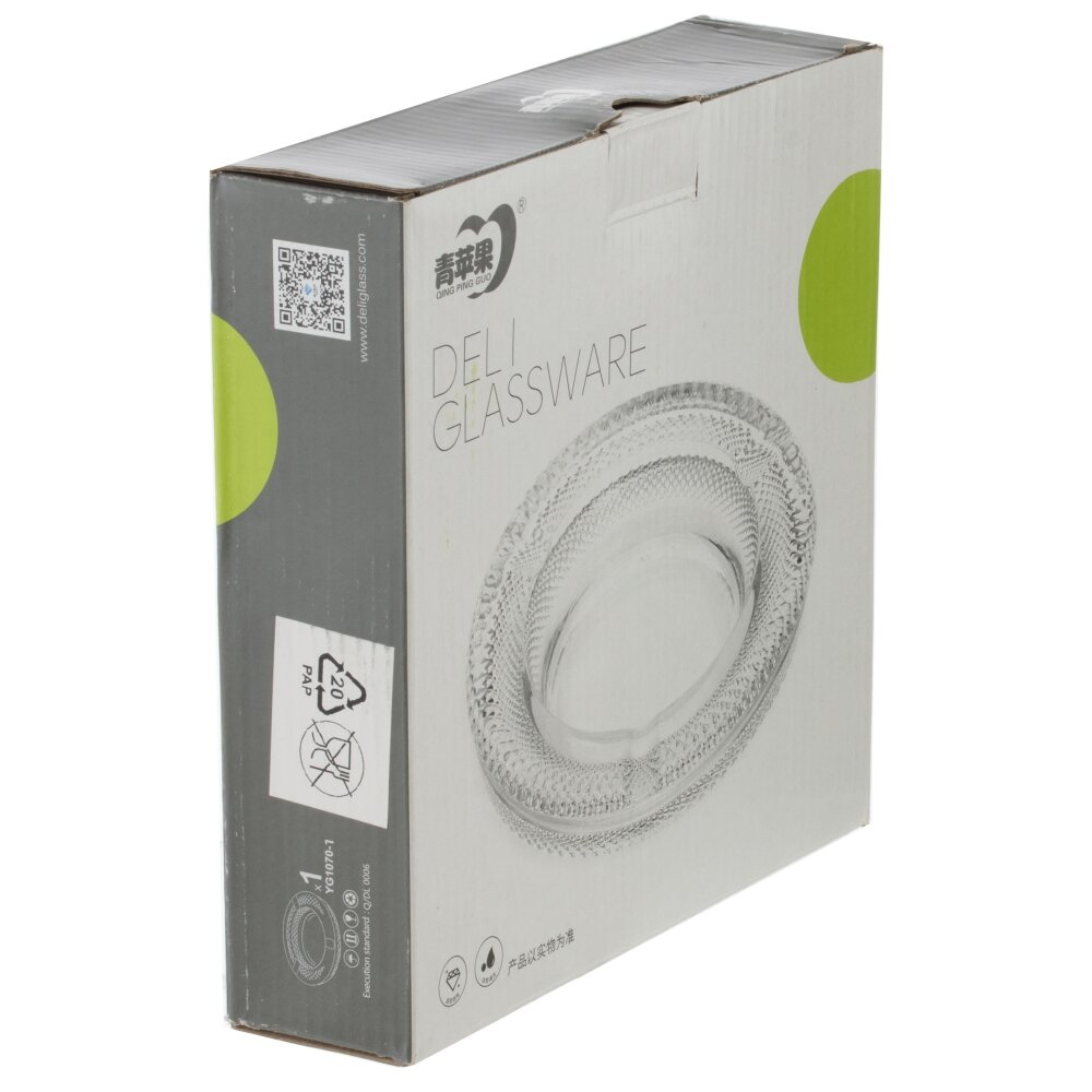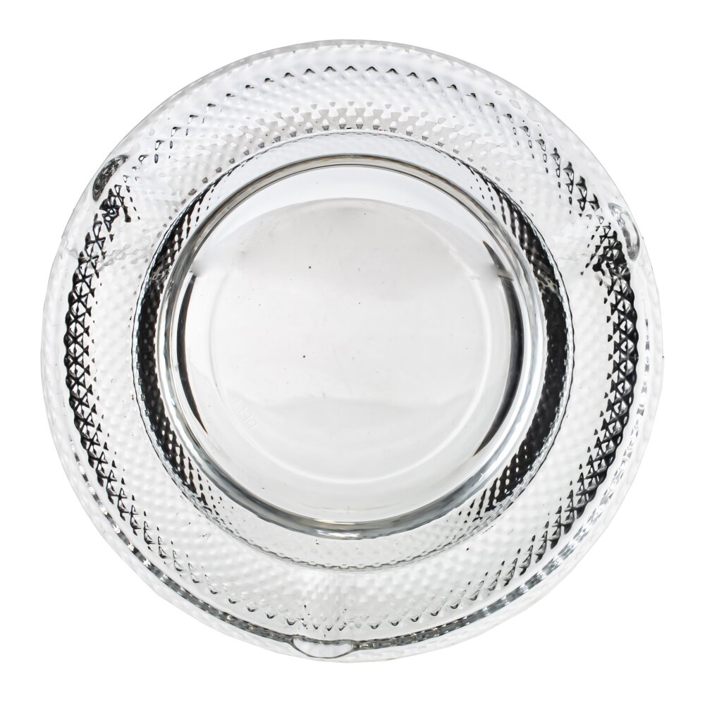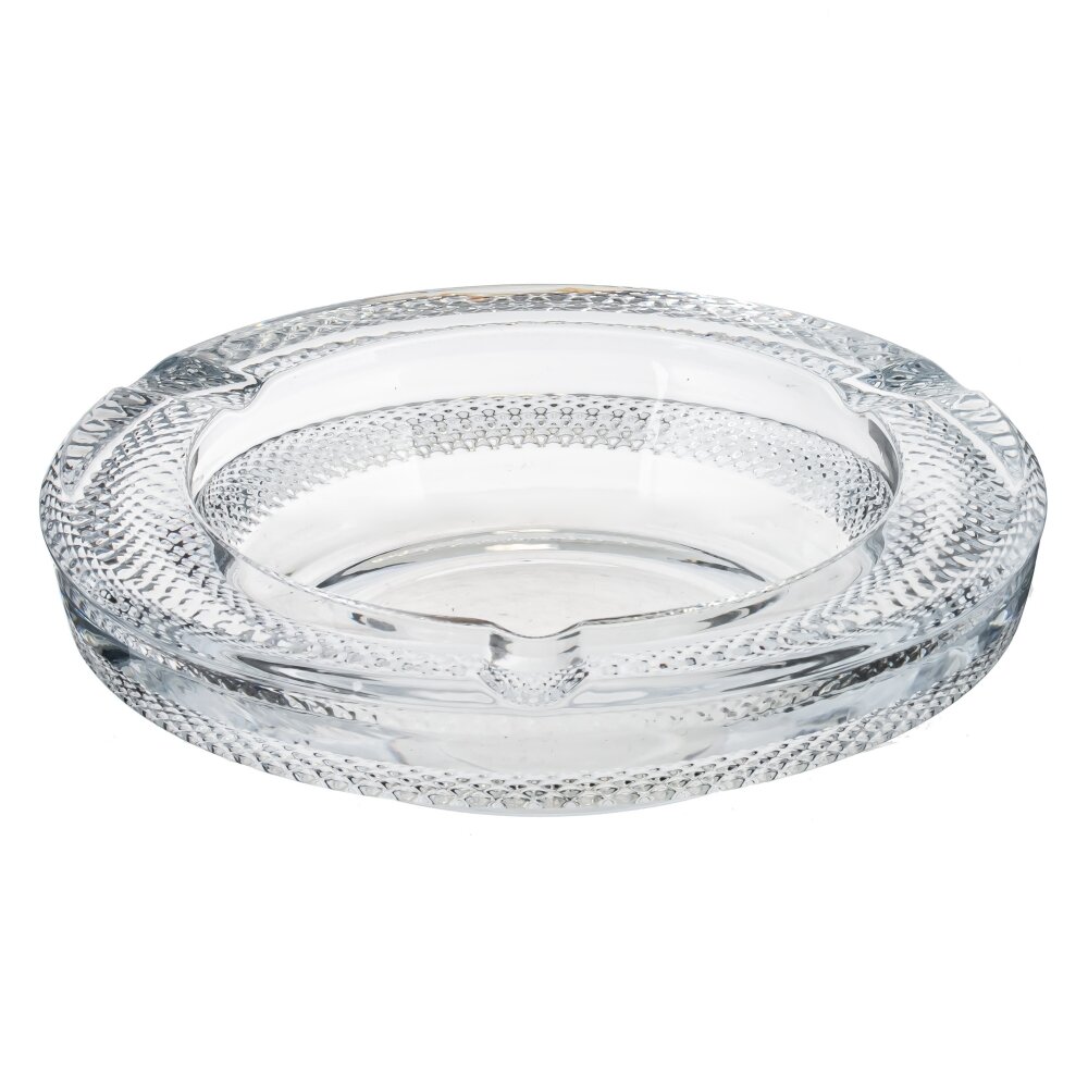 Круглая пепельница из прозрачного стекла с утолщёнными стенками. Широкий бортик украшён рельефным узором, напоминающим мелкую алмазную грань, благодаря чему предмет красиво переливается и не выскальзывает из рук. По окружности предусмотрены четыре аккуратные выемки для сигарет. Внутренняя чаша гладкая и глубокая, что помогает удерживать пепел и тлеющие угольки. Массивное стекло придаёт устойчивость на столе и долговечность в использовании. Лаконичный, классический дизайн делает пепельницу уместной в доме, офисе или кафе; материал легко моется и выдерживает высокие температуры, сохраняя прозрачность и блеск.