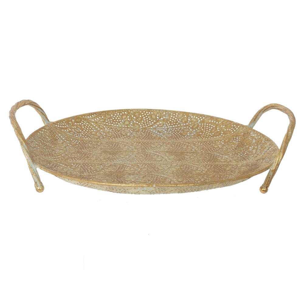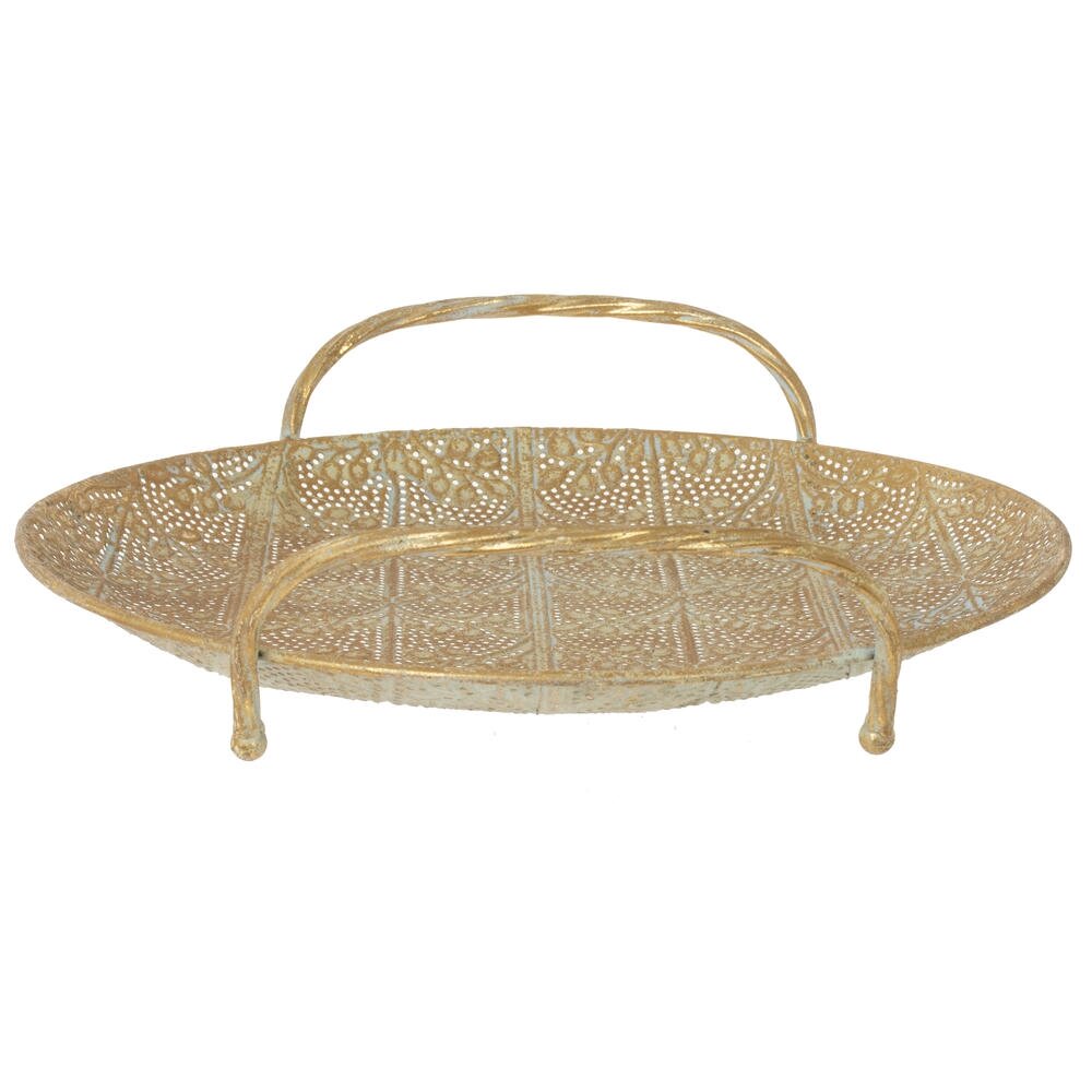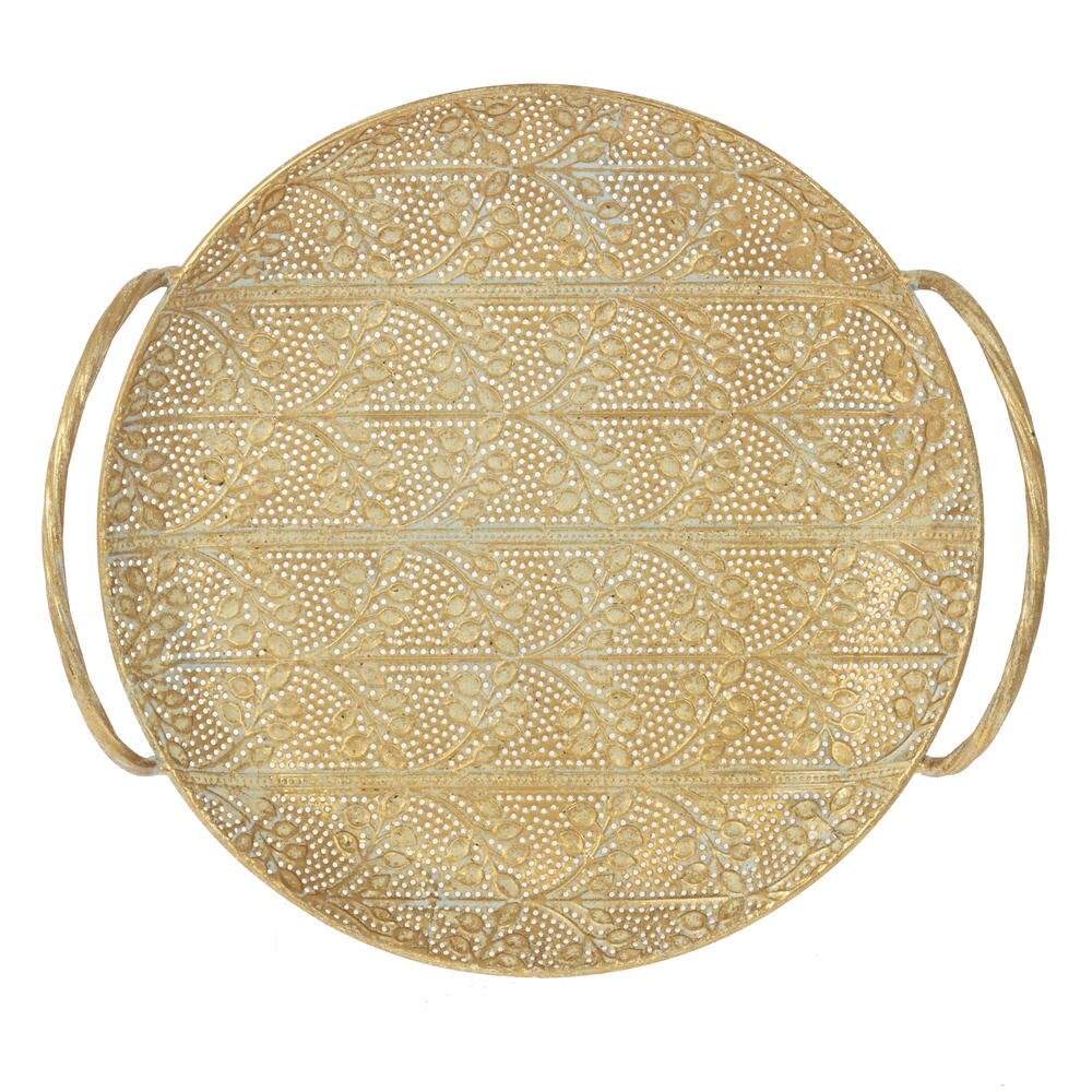 Элегантный металлический поднос круглой формы с изящными ручками – стильный акцент для сервировки и декора. Поверхность украшена ажурным перфорационным рисунком с растительными мотивами, создающим эффект ручной работы и придающим изделию винтажный, слегка состаренный вид. Удобные высокие ручки обеспечивают надежный хват и позволяют безопасно переносить напитки, закуски или посуду. Поднос идеально подходит для подачи завтрака в постель, организации чайной церемонии, сервировки праздничного стола, а также для оформления композиции из свечей, ваз или декоративных фигур. Прочный металл устойчив к деформации и прост в уходе, что делает изделие не только красивым, но и практичным элементом интерьера в классическом, восточном или современном стиле.