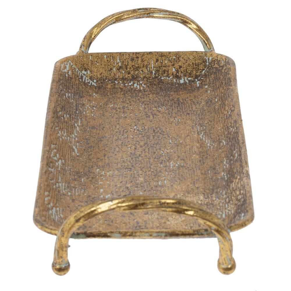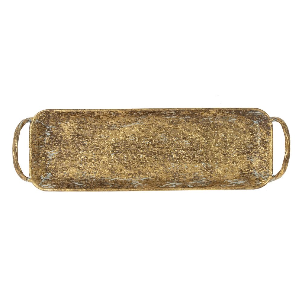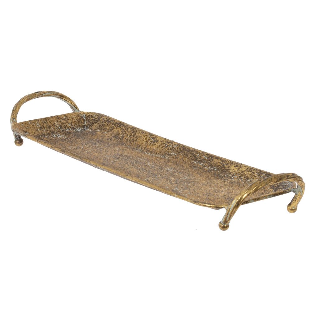 Элегантный декоративный поднос из металла с эффектом благородной старины. Вытянутая прямоугольная форма и слегка приподнятые бортики делают его удобным для сервировки и безопасной переноски предметов. По краям расположены прочные фигурные ручки, обеспечивающие надежный хват. Поверхность оформлена под старое золото/бронзу с легкой патиной, что придает изделию винтажный характер и делает его эффектным акцентом в интерьере в стилях лофт, ретро или классика. Поднос можно использовать для подачи напитков, сладостей, фруктов, а также как основу для декоративных композиций со свечами, вазами или статуэтками. Прочный металл гарантирует долговечность и простоту ухода.