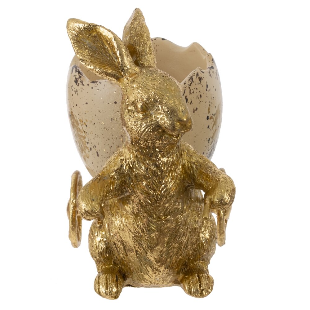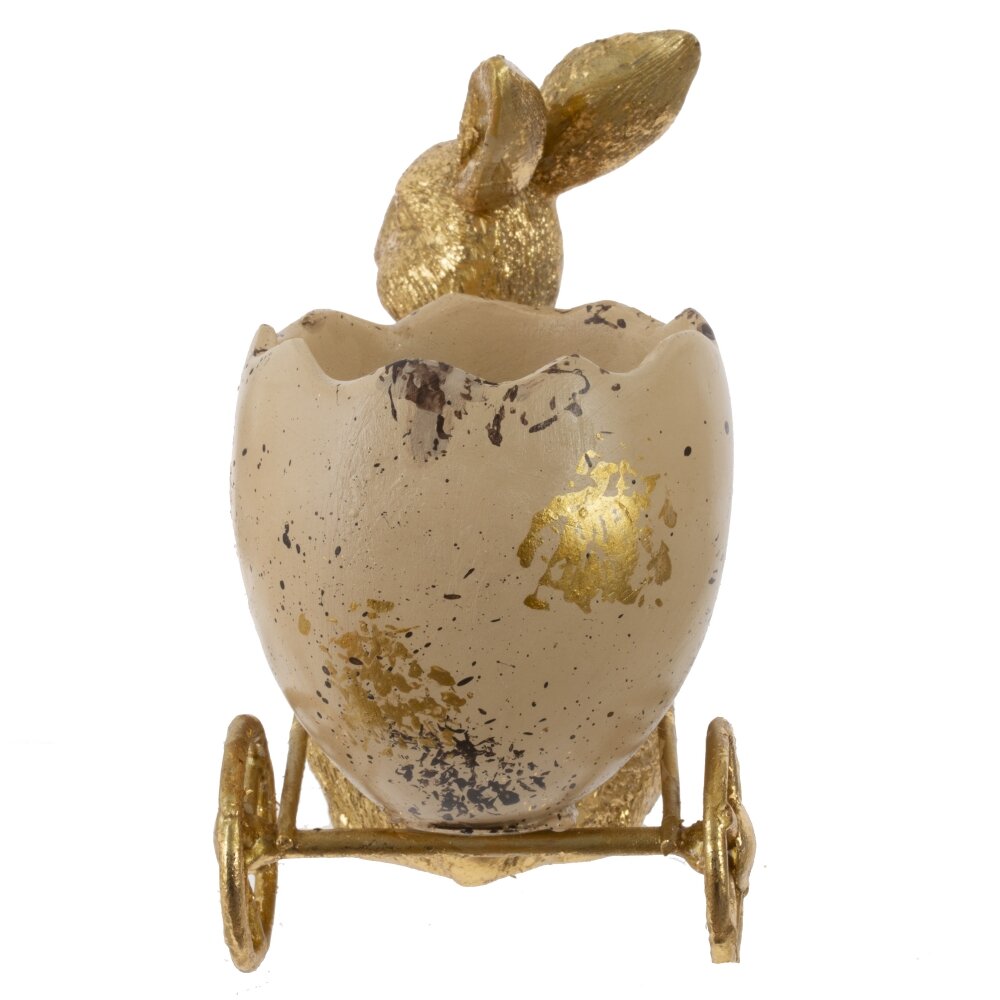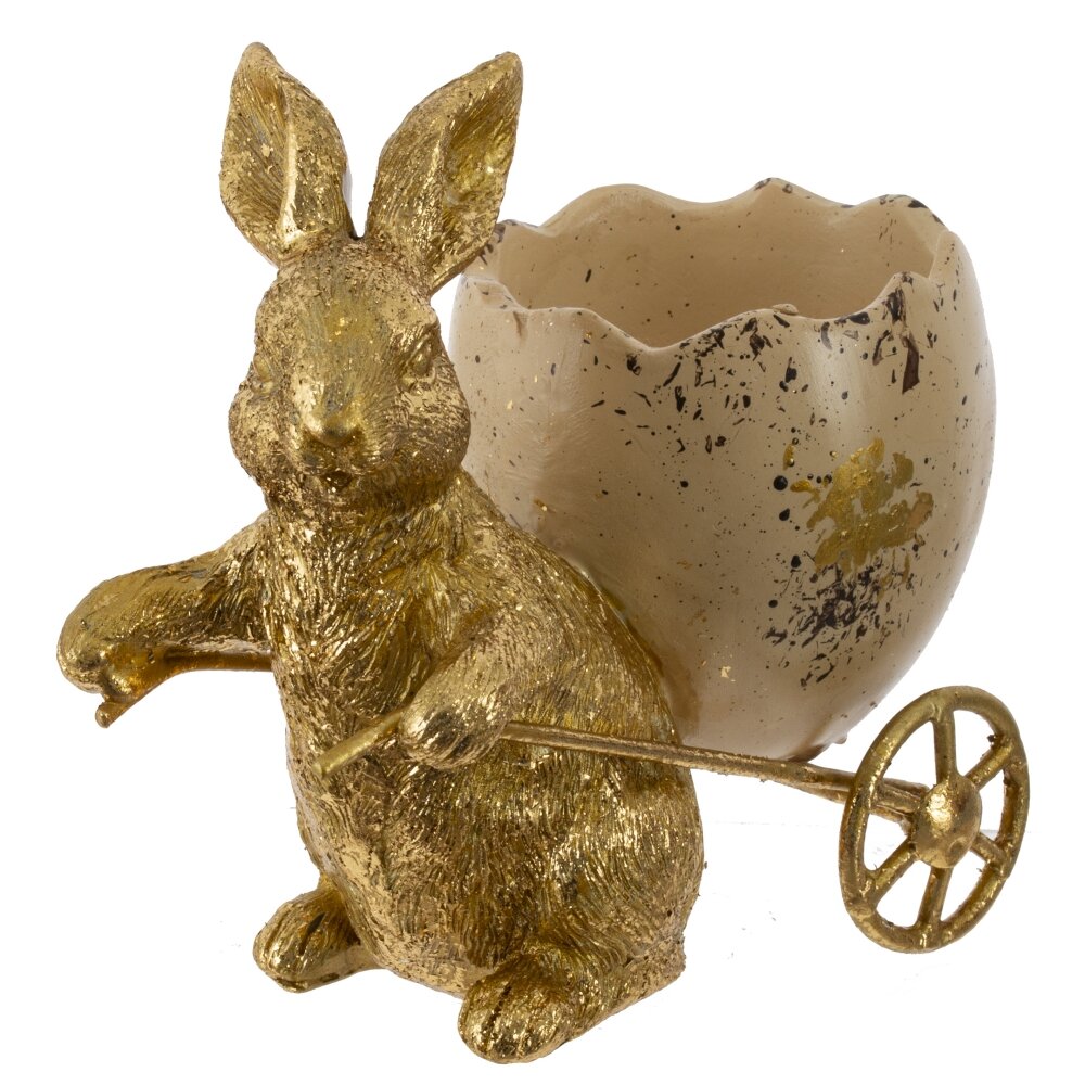 Декоративная подставка для яйца «Заяц» – стильный пасхальный акцент для украшения интерьера. Фигурка золотистого зайчика везёт на тележке крупное яйцо-скорлупу с эффектом крапинок и потёртостей, создавая ощущение ручной работы. В ёмкость можно поместить пасхальное яйцо, небольшие сладости, декоративные яйца или мини-композицию из цветов. Изделие выполнено из прочных полимерных материалов, устойчиво стоит на поверхности и подходит для многократного использования. Идеальное дополнение к пасхальной коллекции декора или оригинальный подарок к светлому празднику.