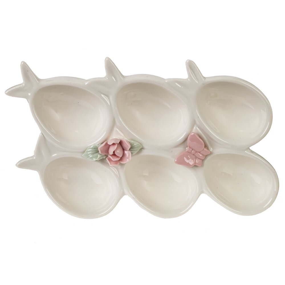Изящная пасхальная подставка для 6-ти яиц из фарфора станет главным акцентом праздничного стола. Белоснежная поверхность гармонично сочетается с объёмным декором в виде нежного розового цветка и бабочки, придавая сервировке лёгкость и весеннее настроение. Углубления аккуратно фиксируют яйца, защищая их от скатывания и ударов. Подставка идеально подходит для пасхальных яиц , уместна как на семейном завтраке, так и на торжественном чаепитии. Стильный, практичный и долговечный аксессуар, который подчеркнёт заботу о деталях и станет прекрасным подарком к Пасхе.