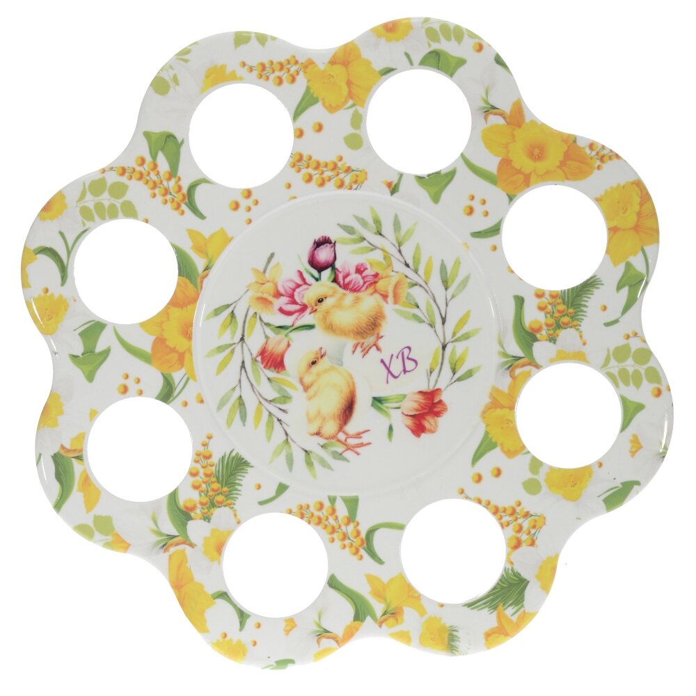 Пасхальная керамическая подставка для 8 яиц — стильное украшение праздничного стола. Изделие выполнено в форме цветка с восемью аккуратными отверстиями для крашенок или декоративных яиц. В центре подставки — яркий рисунок с цыплятами, цветами и надписью «ХВ», по краю — весенний орнамент из жёлтых и оранжевых цветов. Гладкая глазурованная поверхность легко моется и не впитывает запахи, а прочная керамика надёжно удерживает яйца, предохраняя их от скатывания. Такая подставка создаст атмосферу уюта и радости, станет красивым акцентом сервировки и отличным подарком к Пасхе.