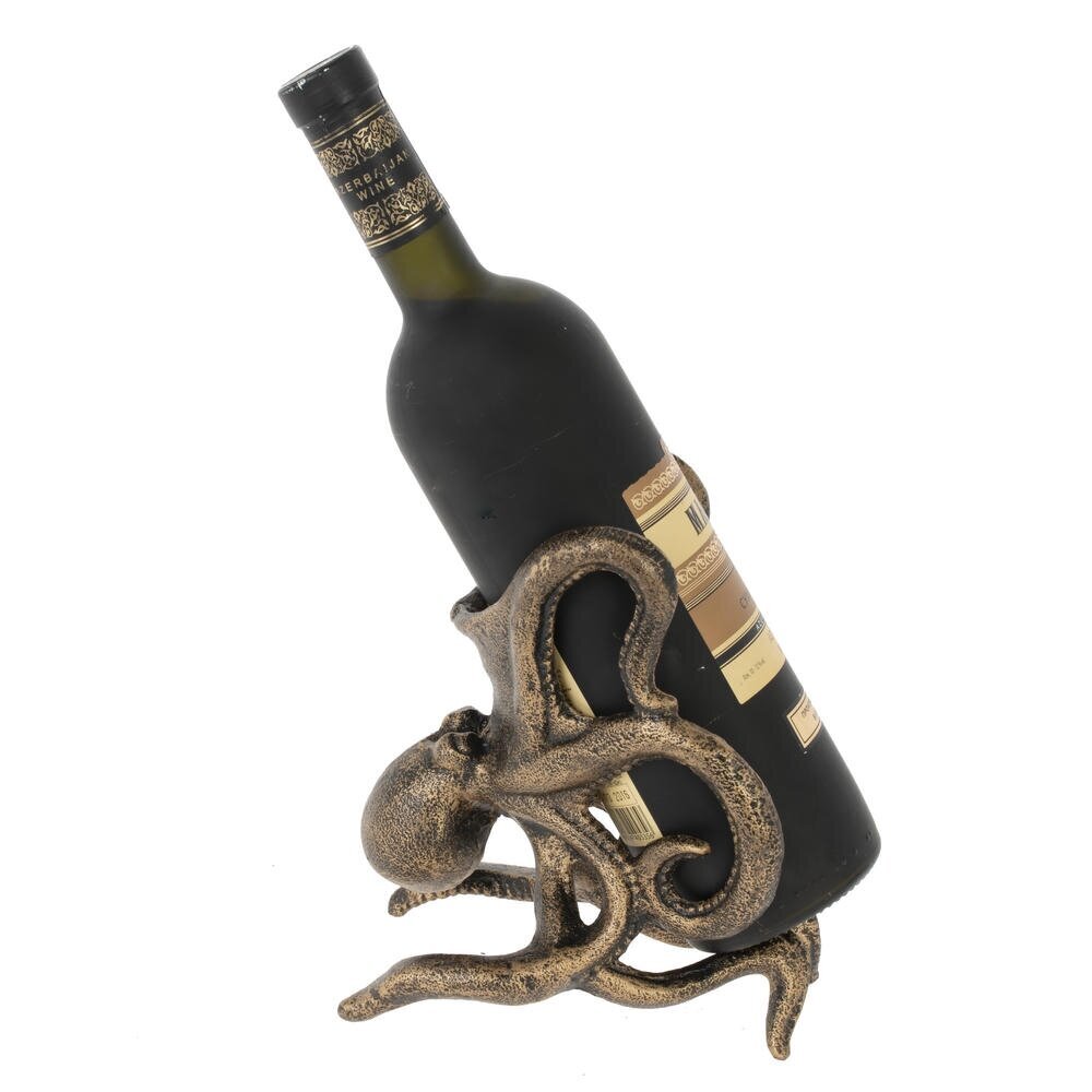 Эффектная подставка для бутылки «Осьминог» станет ярким акцентом вашего стола или домашнего бара. Фигура морского обитателя выполнена из прочного металла с благородным покрытием под старую бронзу, что придаёт изделию винтажный, слегка антикварный вид. Изогнутые щупальца надёжно фиксируют бутылку вина или другого напитка, обеспечивая устойчивость и защищая её от случайного опрокидывания. Подставка гармонично вписывается в интерьер в морском, винтажном или лофт?стиле и станет оригинальным подарком ценителям нестандартного декора и красивой сервировки.