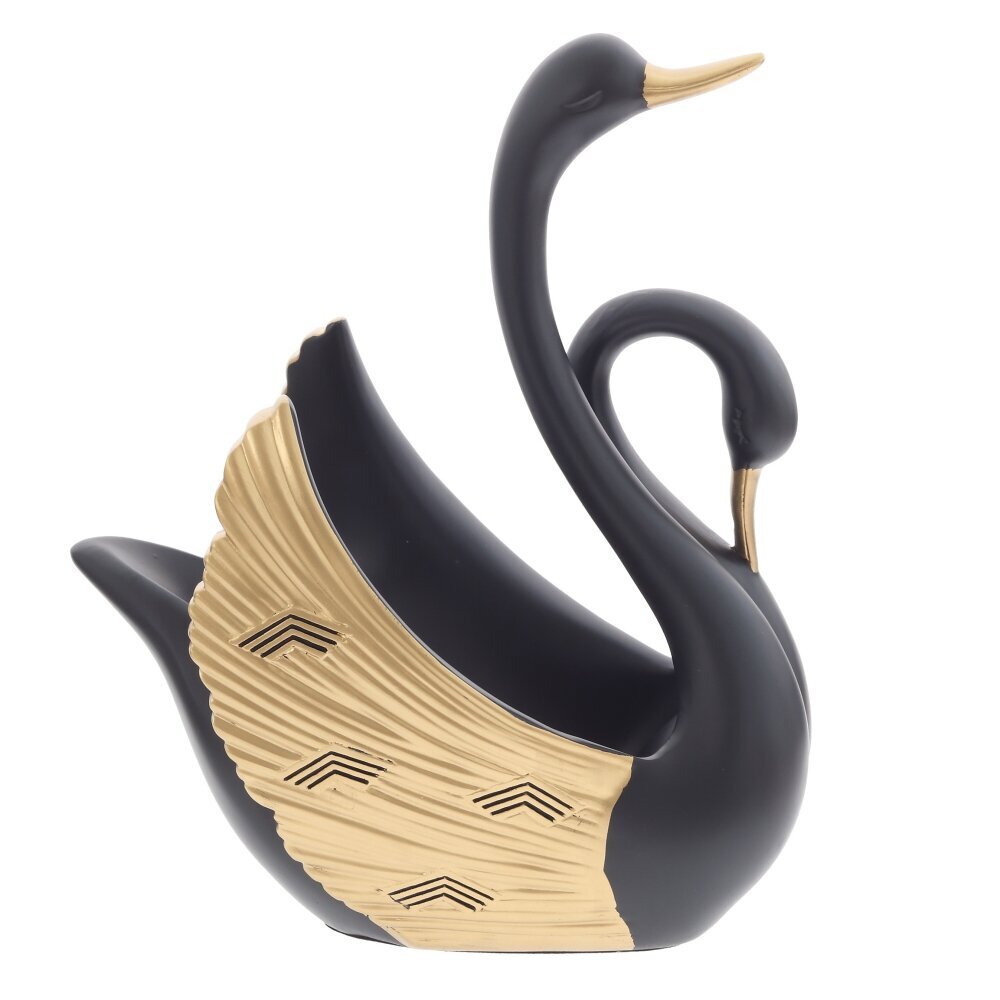 Элегантная подставка для бутылки «Лебеди» — стильный акцент для современного интерьера и сервировки стола. Изделие выполнено из прочных полимерных материалов, сочетающих легкость и устойчивость. Матовый чёрный корпус выгодно оттенён золотыми деталями крыльев и клювов, создавая ощущение роскоши. Форма двух грациозных лебедей надёжно фиксирует бутылку вина или шампанского, предотвращая её опрокидывание. Подставка идеально подойдёт для праздничного стола, романтического ужина или в качестве оригинального подарка ценителям красивых аксессуаров для дома.