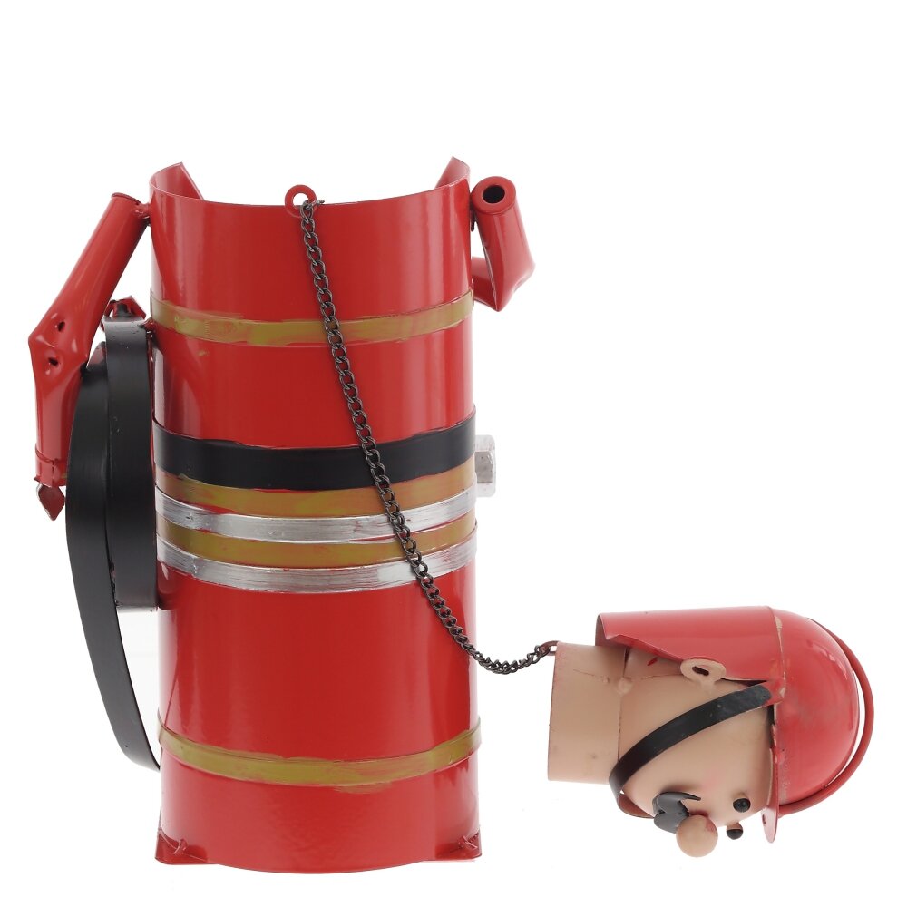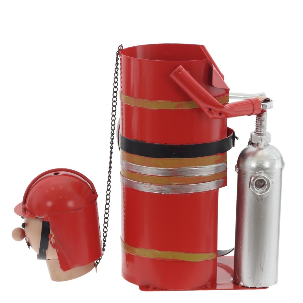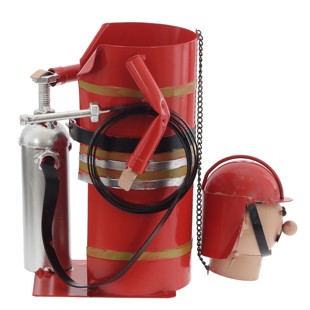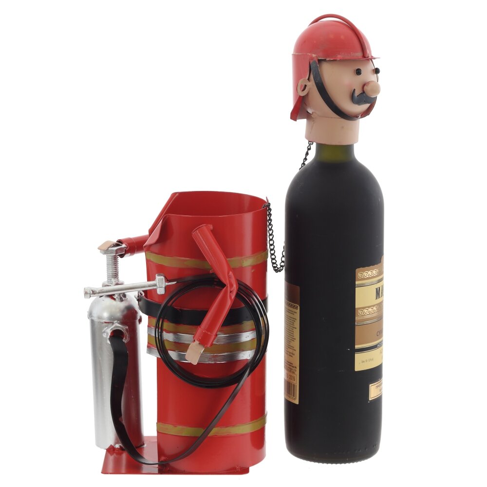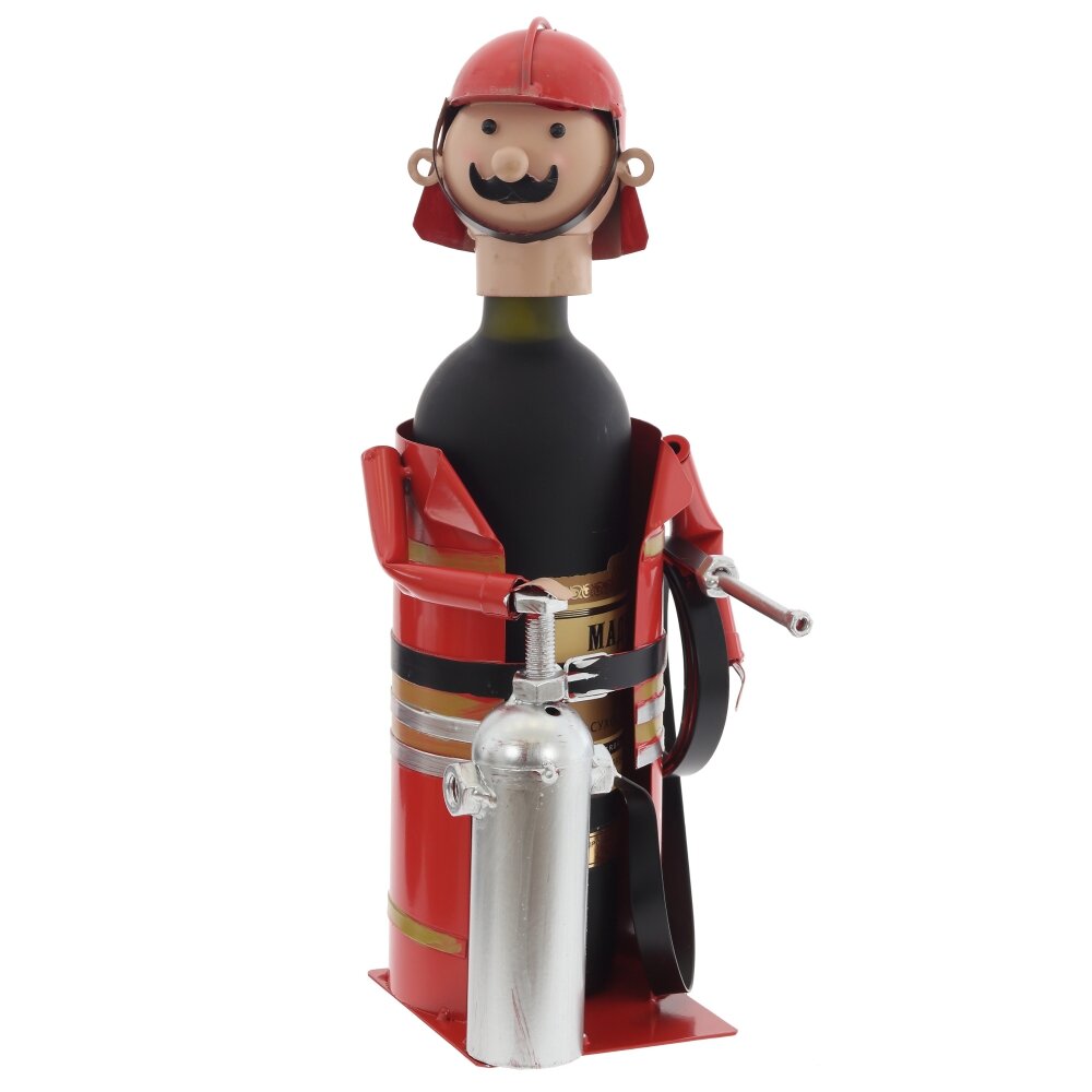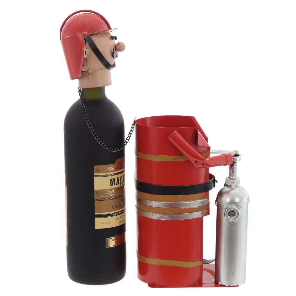 Оригинальная подставка для бутылки в виде пожарного – яркий акцент для любого интерьера и отличный подарок мужчине. Изделие полностью выполнено из металла, покрыто насыщенной красной эмалью. Корпус имитирует форму пожарного костюма с ремнём, баллоном и шлангом, а съёмная голова?шлем служит декоративной крышкой для горлышка бутылки. Конструкция устойчивая, подходит для стандартных винных и других бутылок похожего диаметра. Такая подставка не только эффектно подаёт напиток на стол, но и становится забавной деталью барной зоны, кабинета или дачного дома.