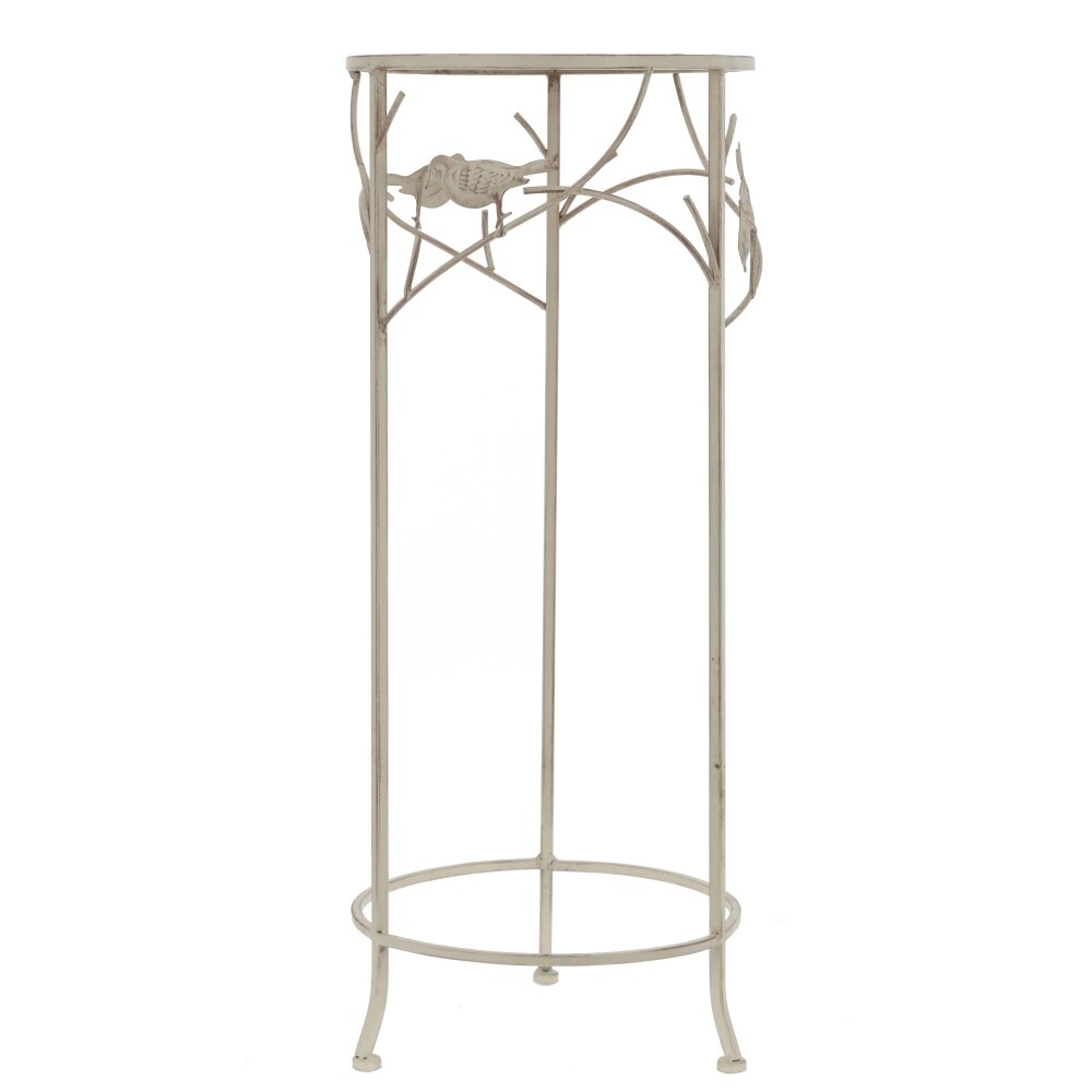 Элегантная металлическая подставка для цветов с круглой ажурной столешницей — изящное решение для оформления интерьера. Высокая тонкая конструкция визуально легкая, но прочная и устойчивая благодаря круговому основанию и четырём опорам. Боковины украшены декоративными ветвями с фигурками птичек, что придаёт подставке романтичный, «садовый» характер и делает её акцентным элементом в комнате, на балконе или в зимнем саду. Светлый оттенок металла органично вписывается в интерьеры в стиле прованс, кантри, шебби?шик и классика. Подставка подходит для размещения комнатных растений в горшках, декоративных композиций и сувениров, помогает выгодно приподнять цветок и создать многоуровневую зелёную зону. Легко переносится и не требует сложного ухода.