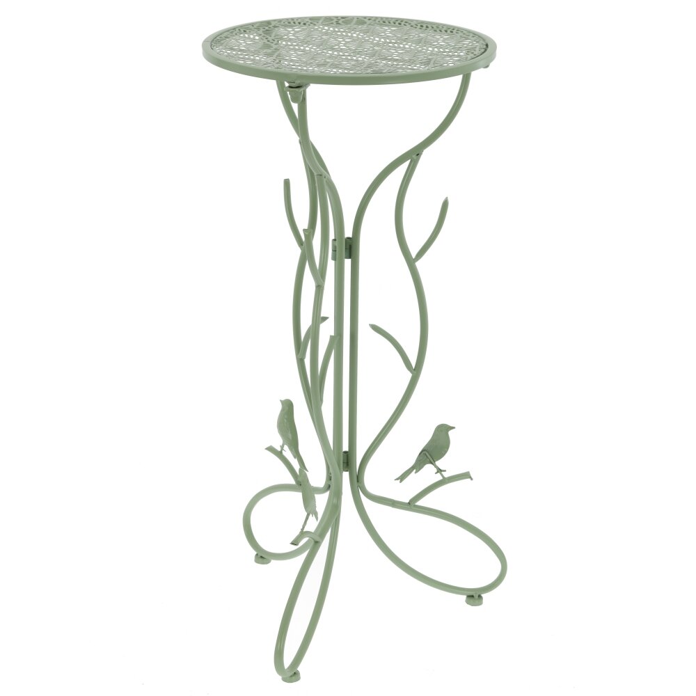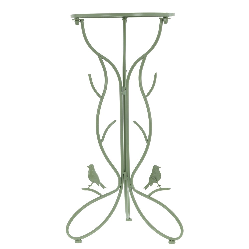 Элегантная металлическая подставка для цветов с круглой ажурной столешницей — изящное решение для оформления интерьера. Высокая тонкая конструкция визуально легкая, но прочная и устойчивая благодаря круговому основанию и четырём опорам. Боковины украшены декоративными ветвями с фигурками птичек, что придаёт подставке романтичный, «садовый» характер и делает её акцентным элементом в комнате, на балконе или в зимнем саду. Светлый оттенок металла органично вписывается в интерьеры в стиле прованс, кантри, шебби?шик и классика. Подставка подходит для размещения комнатных растений в горшках, декоративных композиций и сувениров, помогает выгодно приподнять цветок и создать многоуровневую зелёную зону. Легко переносится и не требует сложного ухода.