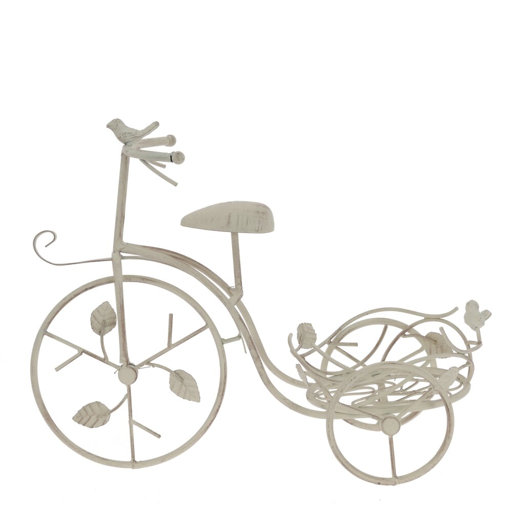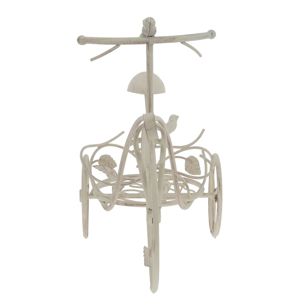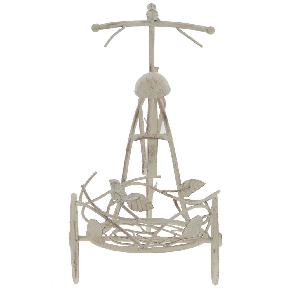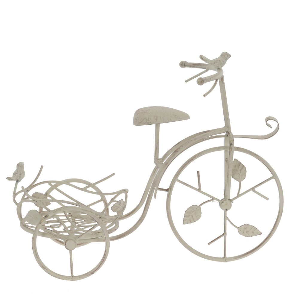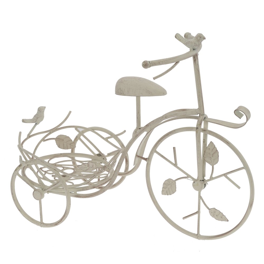 Оригинальная подставка для цветов в виде винтажного велосипеда станет эффектным акцентом в интерьере и саду. Основание выполнено из прочного металла и окрашено в светлый оттенок с легким эффектом старины. Ажурная корзина предназначена для размещения одного или нескольких цветочных горшков, ее изгибы украшены фигурными листочками и миниатюрными птичками, что придаёт изделию романтичный, слегка сказочный вид. Подставка устойчива, подходит для комнатных и уличных растений, гармонично смотрится на балконе, в зимнем саду, на террасе или у входа в дом. Такое декоративное решение помогает выгодно представить цветы и освежить любое пространство.