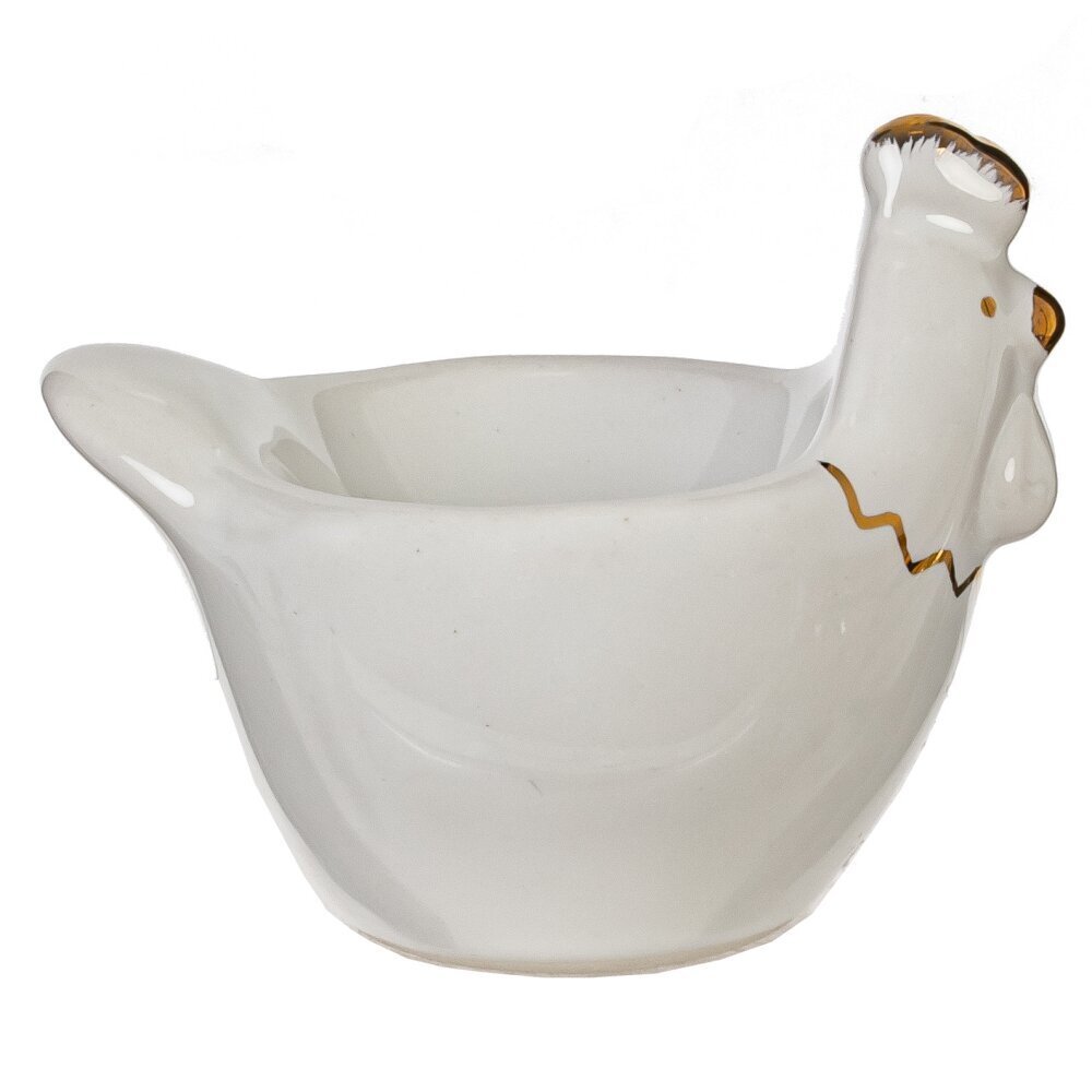 Подставка для яйца «Курочка» — это оригинальный и стильный аксессуар для праздничного стола, особенно на Пасху. Изготовлена из высококачественной керамики, она отличается прочностью и изысканным дизайном. Фигурка курочки придает изделию особый шарм, создавая уютную атмосферу. Идеальна для сервировки вареных яиц, делая прием пищи более эстетичным и приятным. Белый цвет с золотистыми акцентами добавляет элегантности, гармонично сочетаясь с другой праздничной посудой. Отличный подарок и украшение стола на Пасху!