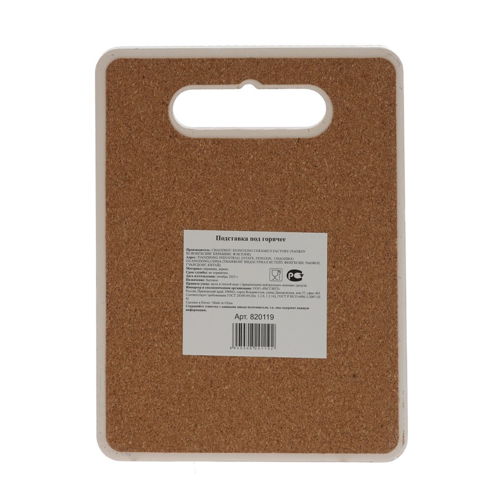Элегантная подставка под горячее из керамики и пробкового дерева станет стильным акцентом на вашей кухне и надежно защитит стол от высоких температур и пятен. Верхняя керамическая поверхность украшена современным абстрактным рисунком в серо?черных тонах с изысканными золотистыми линиями, создающими эффект мрамора. Нижний слой выполнен из натуральной пробки, которая предотвращает скольжение и бережно относится к любой поверхности. Удобное отверстие?ручка позволяет легко переносить подставку и при необходимости вешать ее на крючок для хранения или декора. Подходит для горячих кастрюль, чайников, форм для запекания и сервировки прямо на столе. Стильный и практичный аксессуар для ежедневного использования и отличный подарок любителям красивой посуды.