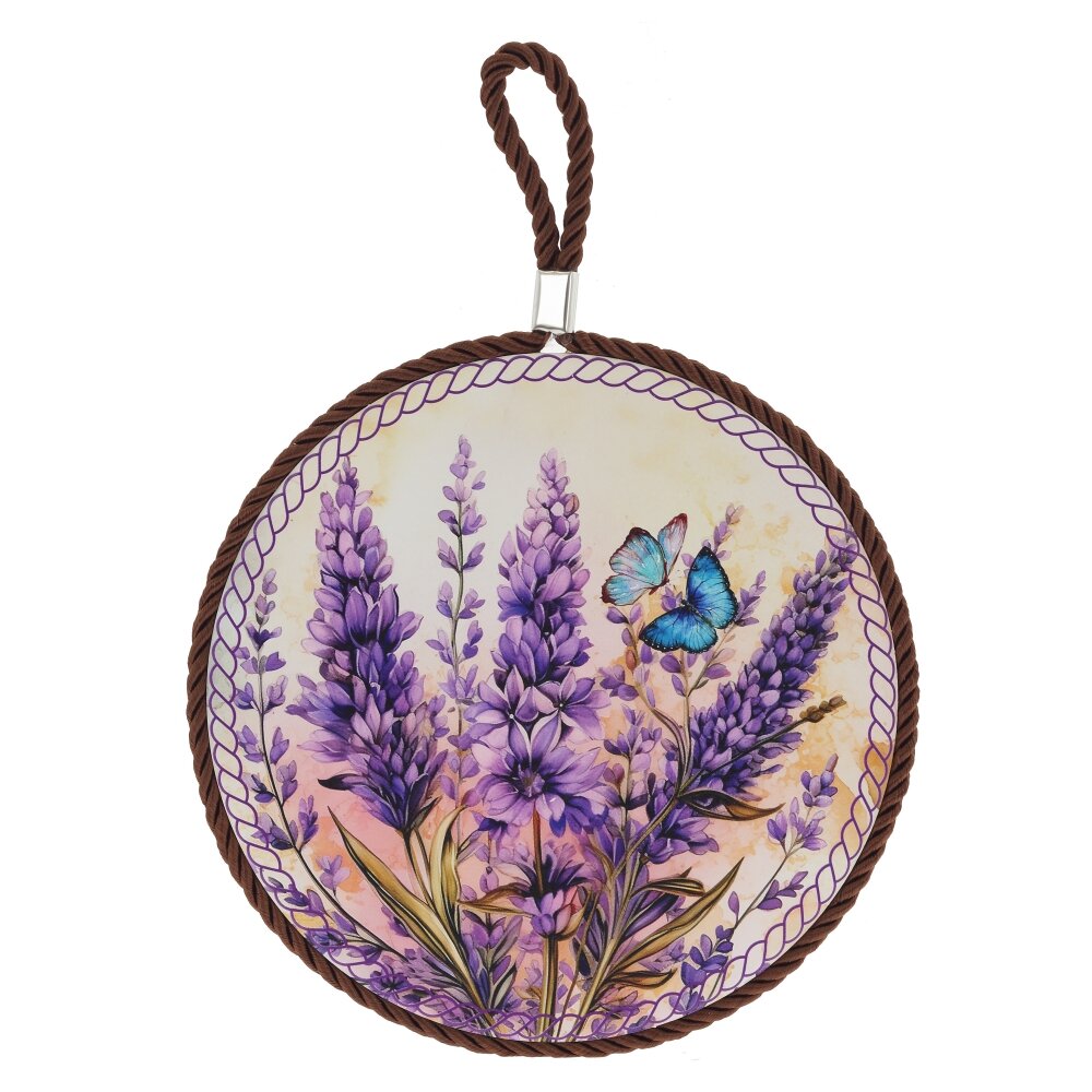Изящная подставка под горячее из керамики и пробкового дерева — стильный и практичный аксессуар для вашей кухни. Керамическая поверхность украшена ярким рисунком лавандового поля с бабочкой, который создаёт атмосферу уюта и лёгкости. Пробковое основание надёжно защищает столешницу от высоких температур и царапин, не скользит и не оставляет следов. Круглая форма и декоративный канат по краю придают изделию особый шарм, а удобная петля позволяет хранить подставку на крючке как красивое панно. Идеально подходит для горячих кастрюль, чайников, сковород и сервировки стола.