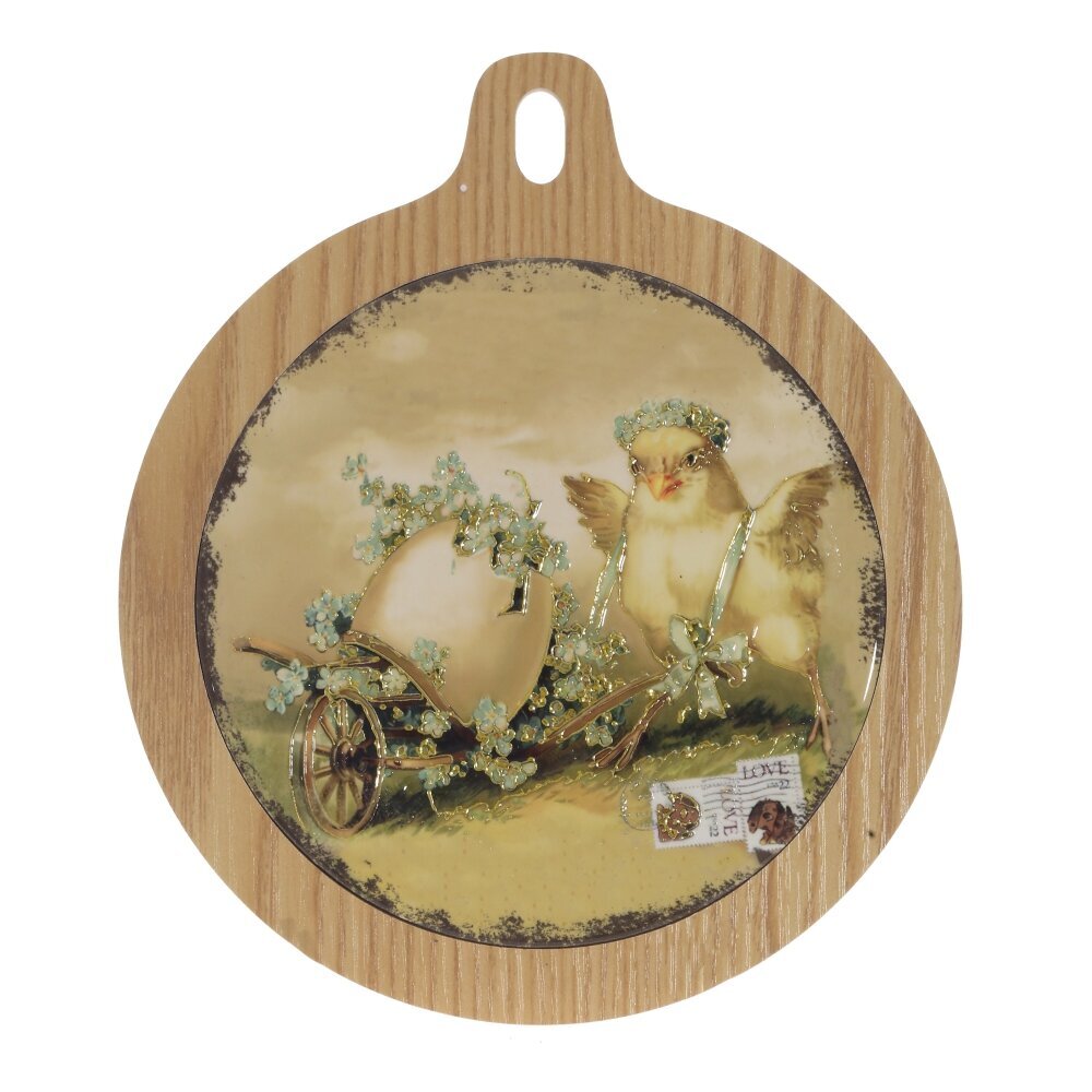 Пасхальная подставка под горячее – стильный и практичный аксессуар для праздничного стола. Круглая основа выполнена из прочного дерева, в центре – керамическая вставка с нежным винтажным рисунком: очаровательный цыплёнок, украшенный венком, и пасхальное яйцо в цветах. Подставка надёжно защищает поверхность стола от горячих кастрюль, чайников и форм для запекания, устойчива к высоким температурам и легко очищается. Удобное отверстие на ручке позволяет вешать её на крючок как декоративный элемент кухни. Идеально дополняет пасхальный декор и станет приятным подарком родным и друзьям.