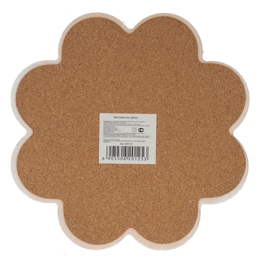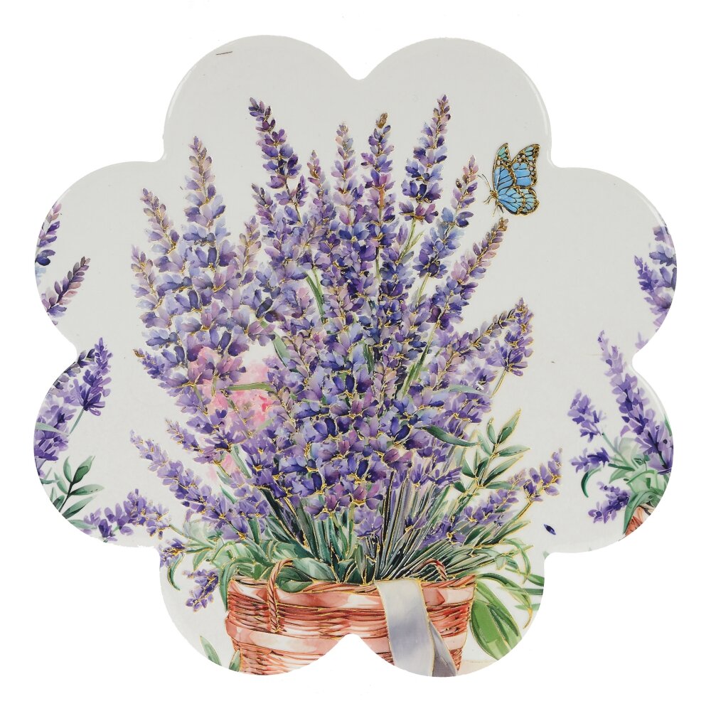 Подставка под горячее с нежным рисунком лаванды – стильный и практичный аксессуар для вашей кухни. Верх выполнен из прочной керамики, которая надежно защищает столешницу от высоких температур и следов от посуды. Основание из натуральной пробковой древесины предотвращает скольжение и бережно относится к любой поверхности. Фигурная форма в виде цветка и детализированный рисунок корзины с лавандой и бабочкой создают атмосферу уюта и прованского шарма. Подставка подходит для горячих кастрюль, чайников, турок и форм для запекания, легко очищается и станет красивым акцентом сервировки стола или приятным подарком для ценителей домашнего комфорта.