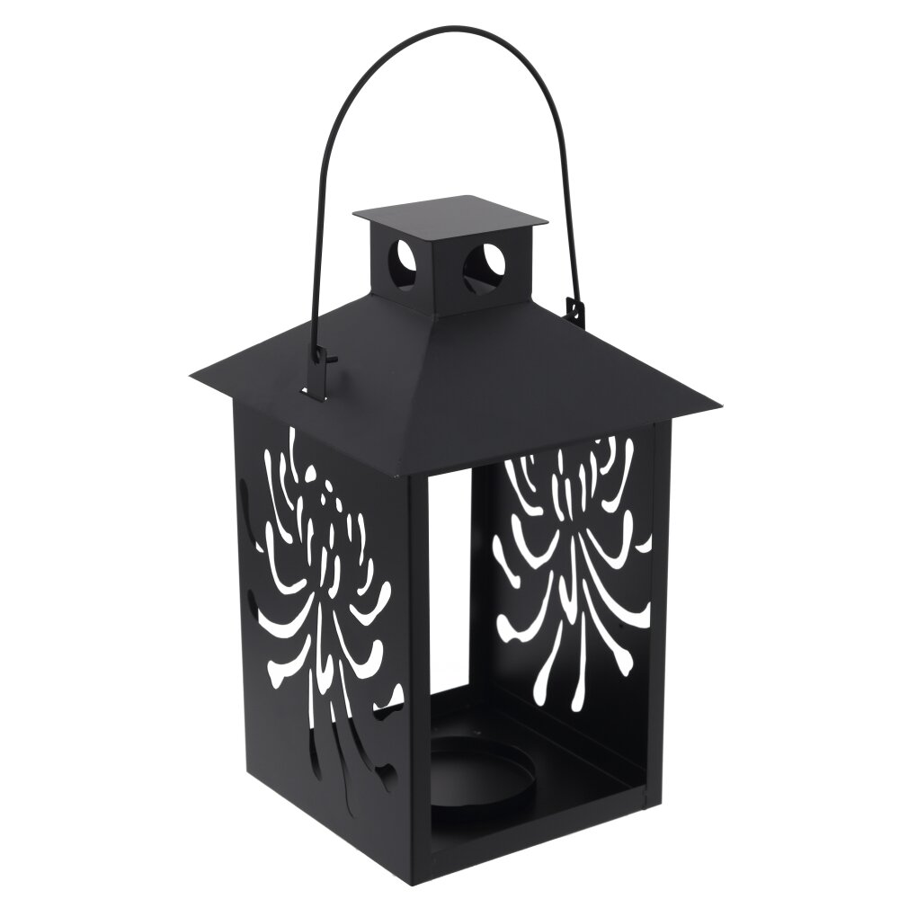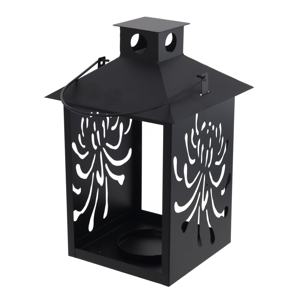 Стильный металлический подсвечник?фонарь в современном минималистичном дизайне. Корпус выполнен из прочного окрашенного металла глубокого черного цвета. Боковые стенки декорированы ажурными прорезями в виде цветочного орнамента, через которые мягко просвечивает огонь свечи, создавая красивые световые узоры на стенах и мебели. Внутри предусмотрено устойчивое металлическое основание для установки свечи?таблетки или небольшой цилиндрической свечи. Удобная дугообразная ручка позволяет переносить подсвечник и подвешивать его на крючок, балконную решетку или в саду. Идеально подходит для украшения интерьера, сервировки праздничного стола, создания уюта на террасе или в загородном доме. Легко сочетается с любым стилем декора.
