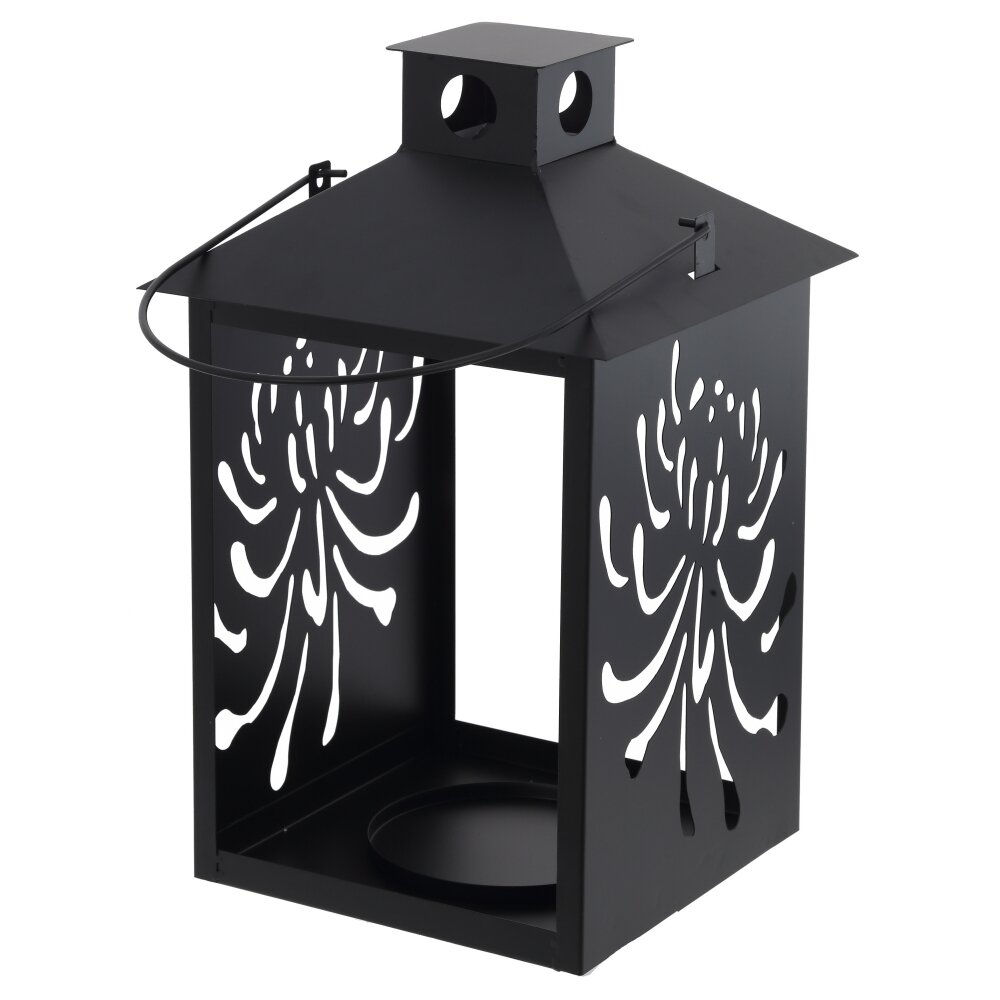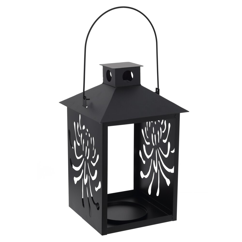 Стильный металлический подсвечник?фонарь в современном минималистичном дизайне. Корпус выполнен из прочного окрашенного металла глубокого черного цвета. Боковые стенки декорированы ажурными прорезями в виде цветочного орнамента, через которые мягко просвечивает огонь свечи, создавая красивые световые узоры на стенах и мебели. Внутри предусмотрено устойчивое металлическое основание для установки свечи?таблетки или небольшой цилиндрической свечи. Удобная дугообразная ручка позволяет переносить подсвечник и подвешивать его на крючок, балконную решетку или в саду. Идеально подходит для украшения интерьера, сервировки праздничного стола, создания уюта на террасе или в загородном доме. Легко сочетается с любым стилем декора.