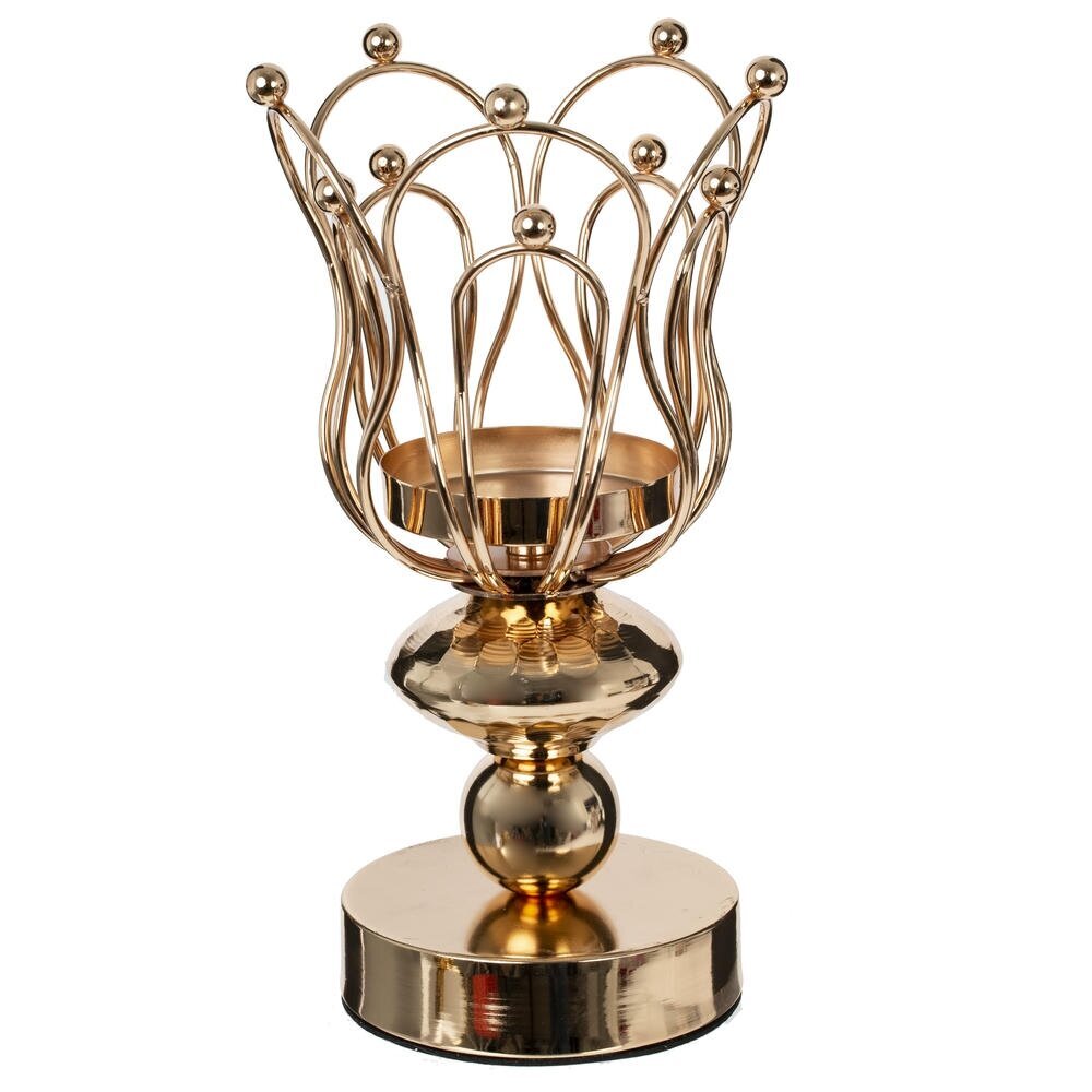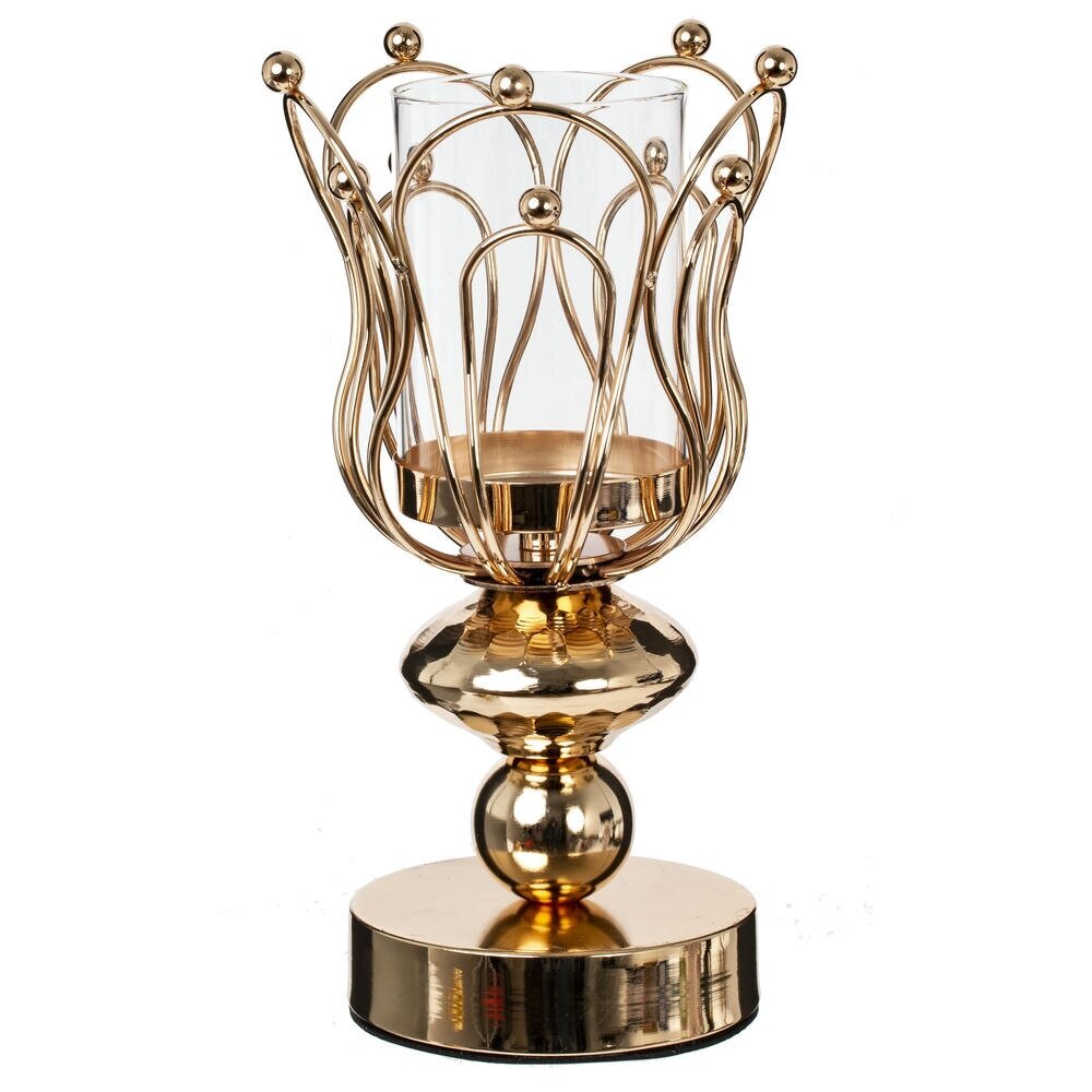 Элегантный подсвечник в современном стиле, выполненный из металла и стекла. Зеркальный золотистый металл образует изящный фигурный каркас в форме лепестков, внутри которого размещён цилиндрический стеклянный плафон. Такая конструкция надёжно защищает пламя свечи от сквозняков и подчёркивает мягкое мерцание света. Устойчивая круглая подставка и плавные декоративные линии делают подсвечник эффектным акцентом для гостиной, спальни или праздничного стола. Идеален для интерьерного декора, романтических вечеров и в качестве стильного подарка. Для свечи, диаметром 6,5 см.