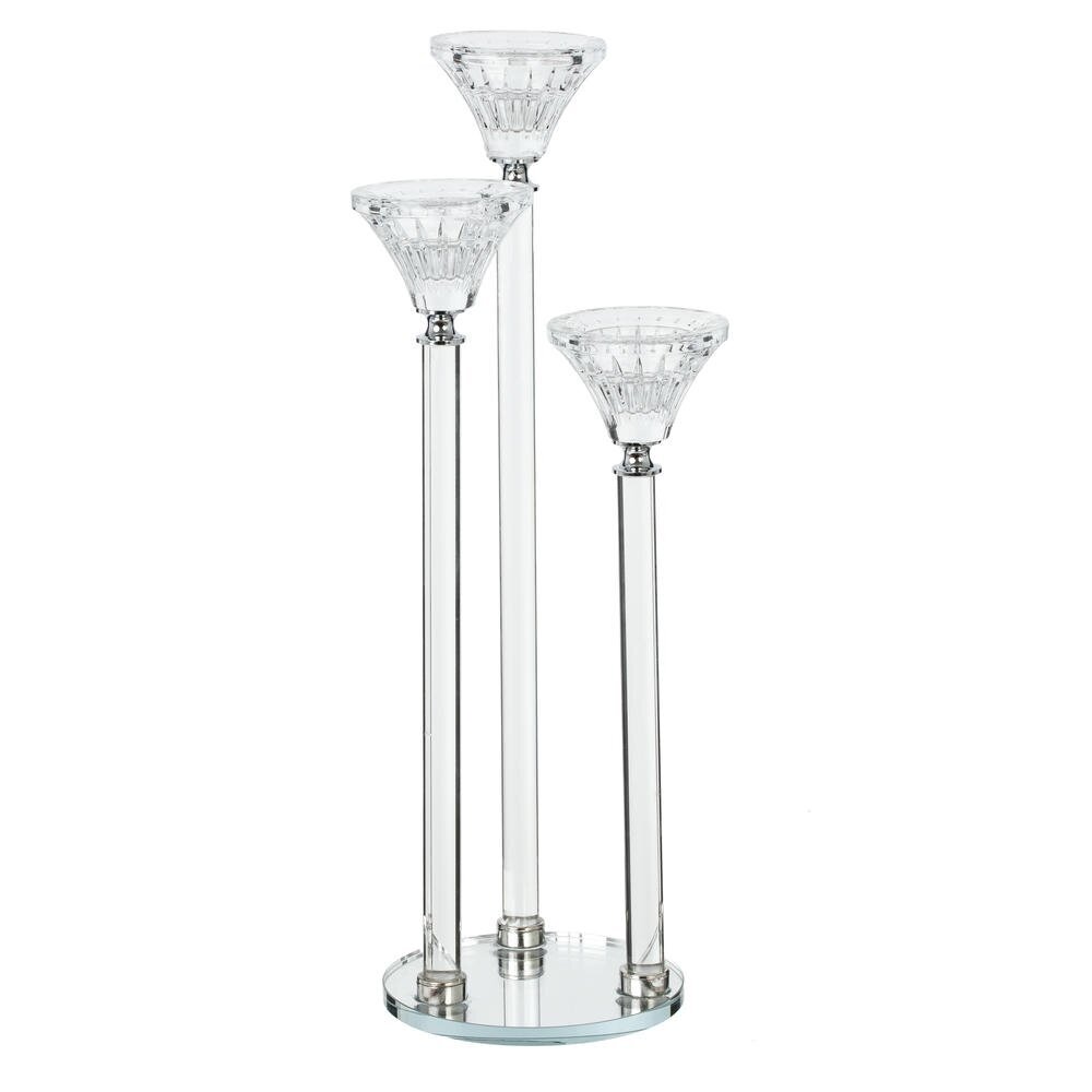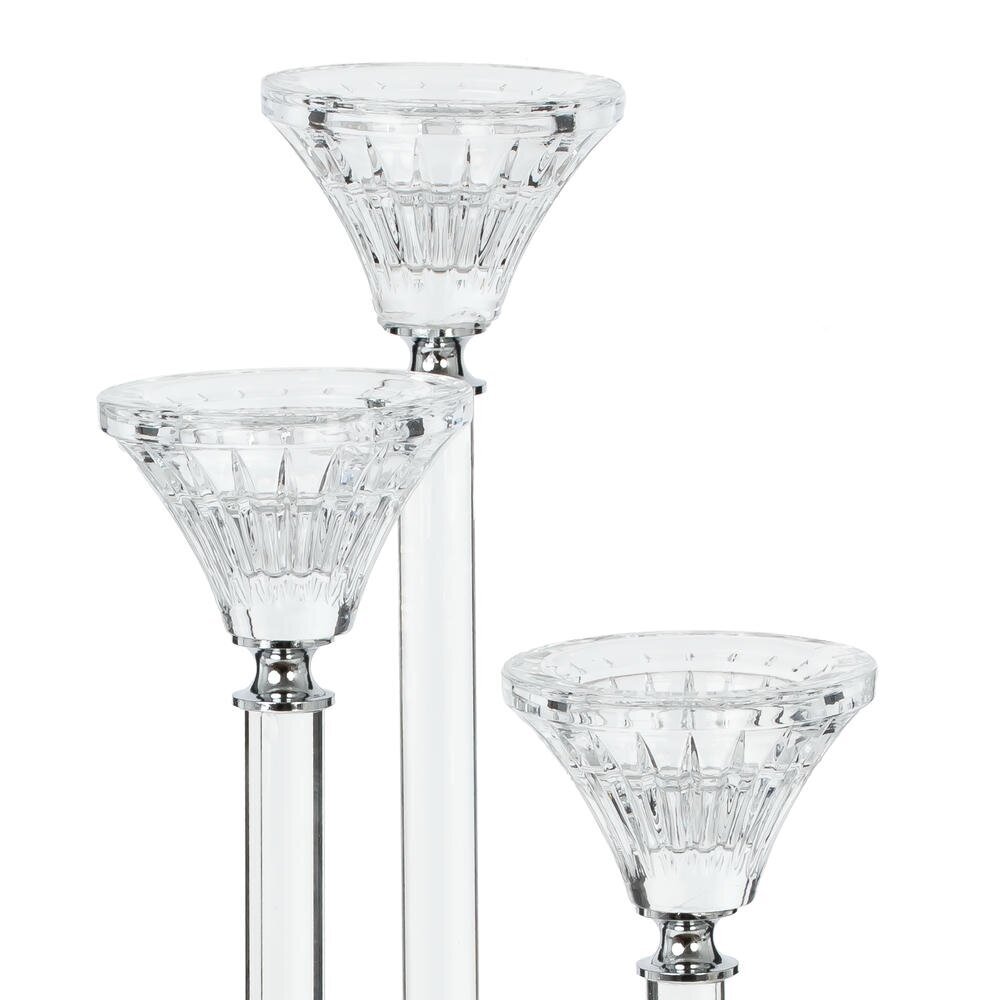Стильный подсвечник из стекла – изящный акцент для современной гостиной, спальни или зоны отдыха. Конструкция с тремя держателями разной высоты создаёт динамичную композицию и красиво подчёркивает игру свечного света. Прозрачные стеклянные чаши и стойки на круглой стеклянной базе смотрятся легко и воздушно, гармонично сочетаясь как с классическим, так и с минималистичным интерьером. Идеален для тонких свечей, подходит для романтических вечеров, сервировки праздничного стола или эффектного декора в отеле, кафе и салоне красоты. Для свечей, диаметром 1,5 см.
